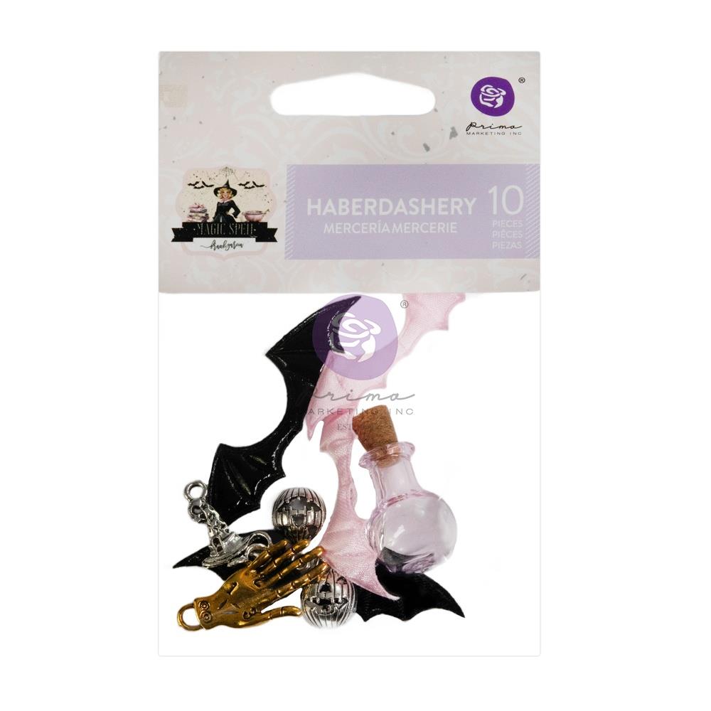 Enhance your next spooky project with the intricate and diverse magic-themed embellishments from Prima Marketing's Magic Spell Haberdashery. This set, designed by industry expert Frank Garcia®, features 10 pieces including bat wings, hand charms, jack o lantern charms, a witch hat charm, and an apothecary bottle. The pack dimensions are 6.5 × 3.5 × 0.125 in.
