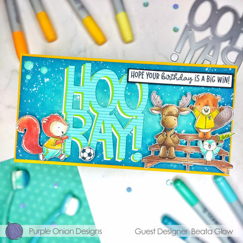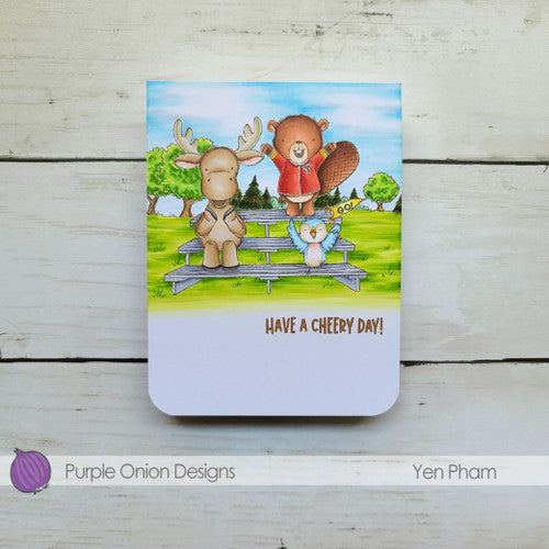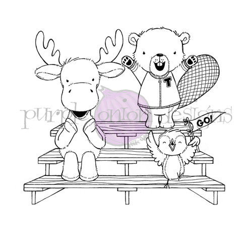 This 3.625 x 3 inch stamp showcases a moose, bird and bear standing and cheering. It was created by Stacey Yacula. Secure it to your acrylic block with an adhesive or cling for stability and precision while stamping. Once set, ink it and press onto your chosen medium for a detailed and elegant design.