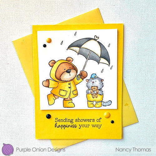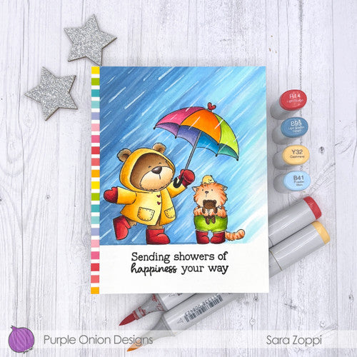 This stamp set, measuring 3.5 x 3.75 inches, showcases a cute bear, cat, and chick huddled together under an umbrella in the rain. It was created by Chilliezgraphy by Pei design. To use this stamp, you will need an adhesive or cling to attach it to your acrylic block, ensuring stability and precision during the stamping process. Once secured, the stamp is ready to be inked and pressed onto your chosen medium, leaving behind a lovely and intricate design.