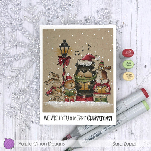 Discover the perfect holiday addition to your crafting projects with the Purple Onion Designs Tofu And Friends Christmas Carol Cling Stamp. Featuring a Chilliezgraphy by Pei design, this cling stamp offers the charm of five adorable animals—a bunny, cat, bear, dog, and bird—singing carols together in the light of a street lamp. Measuring 3.75 x 3.625 inches, it's an ideal size for adding festive cheer to cards, scrapbooks, and other projects. To use this stamp, you will need an adhesive or cling material to attach it to your acrylic block. Once secured, you can effortlessly transfer the design onto your desired surface, whether it's paper, fabric, or any other compatible material. The high-quality red rubber material ensures clear and crisp impressions every time.