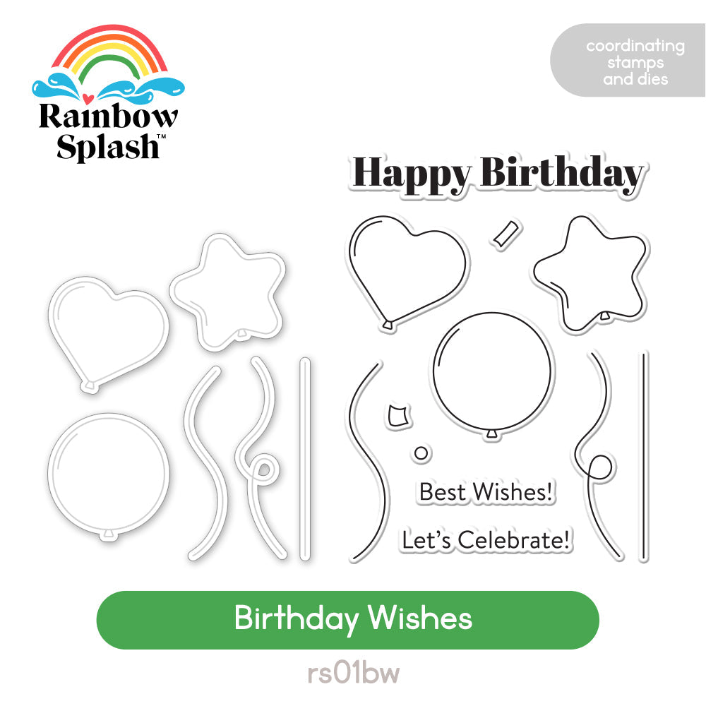 Introducing the Rainbow Splash Birthday Wishes stamp and die set—a must-have for crafting personalized celebratory greetings. This versatile set includes three charming balloon stamps (heart, star, round), complete with strings and confetti details. Accompanied by three heartfelt sentiments, this stamp set equips you to create a variety of festive designs. The sentiments are: