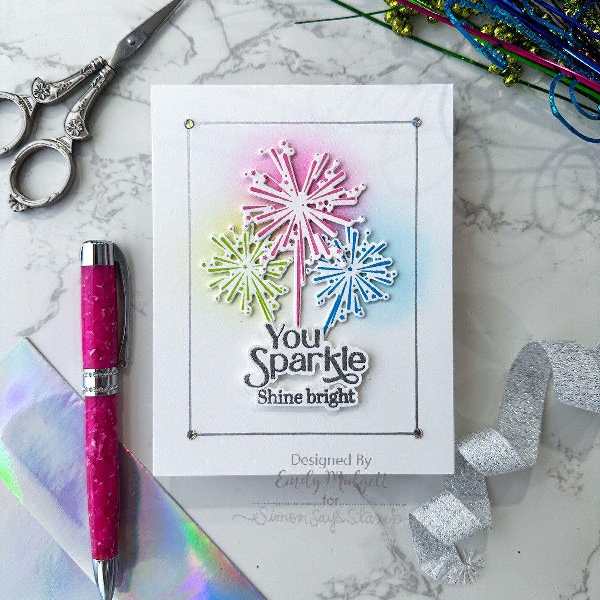 The dies cut out the 4 firework bursts from the stamp set to bring festive sparkle to your crafting projects! Rainbow Splash products are available exclusively at Simon Says Stamp.