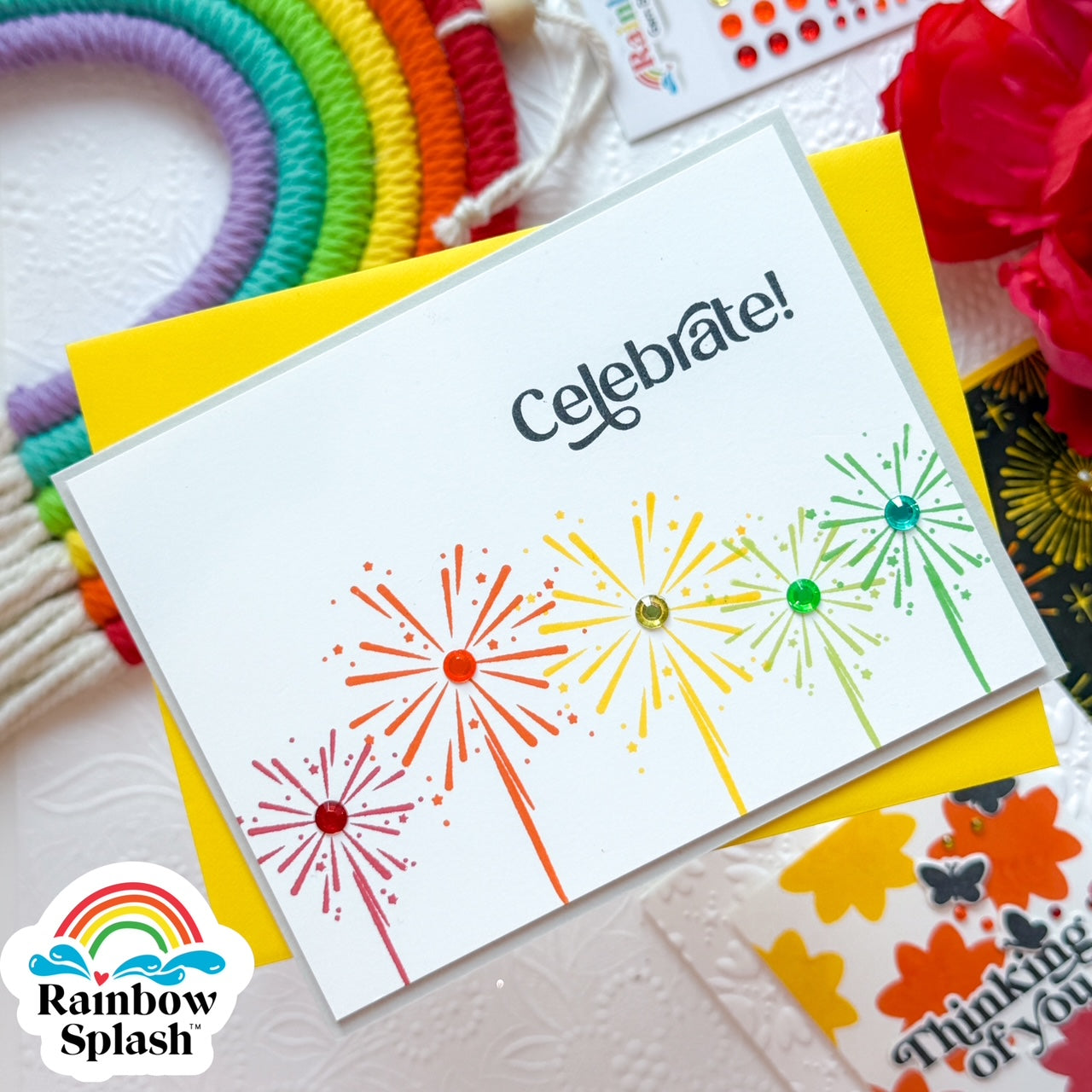 The Rainbow Splash Firework Sparkle stamp set is ideal for birthdays, New Year's, patriotic holidays, and other celebrations!