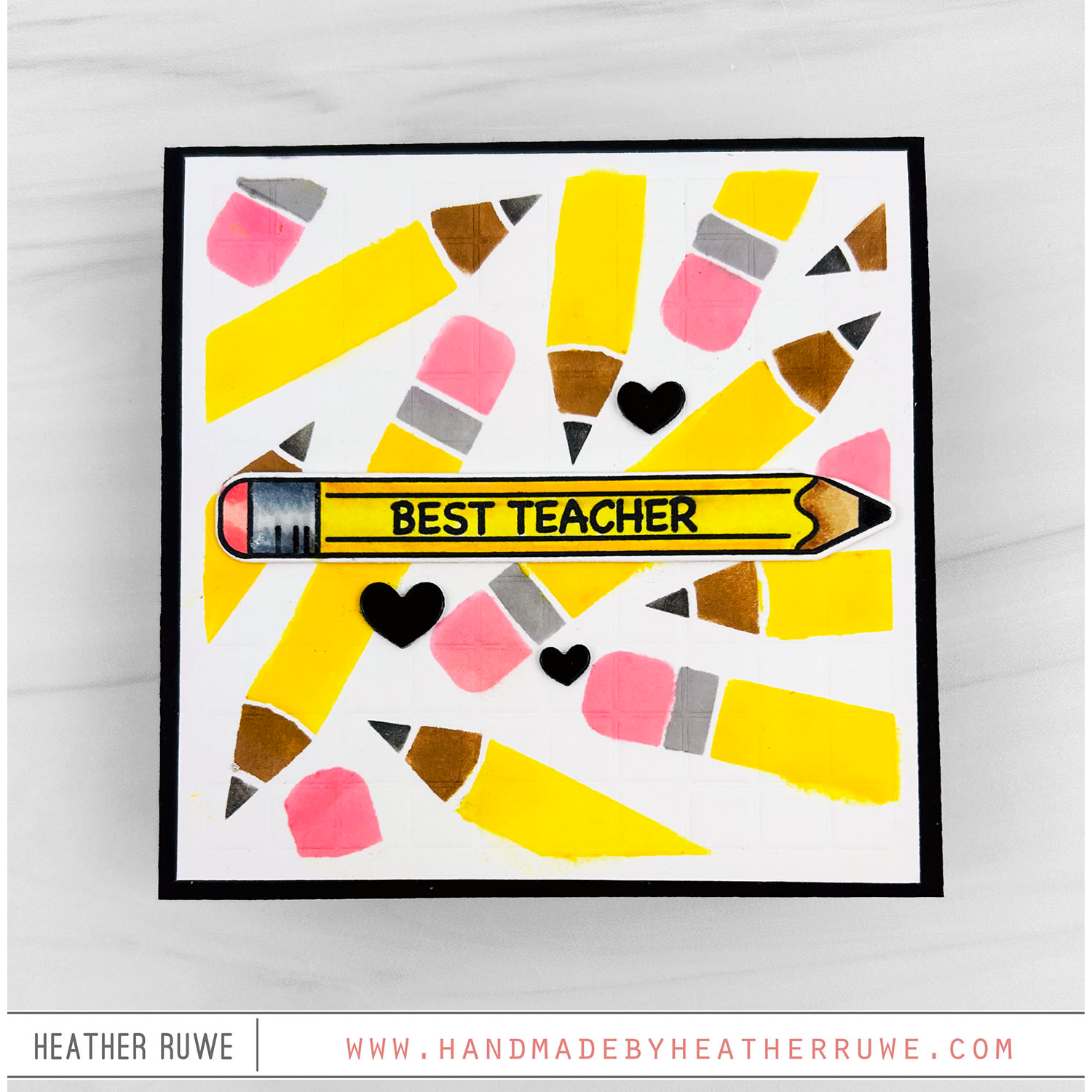 The Rainbow Splash Pencils stencil creates a simple background panel featuring scattered pencils with erasers and sharpened tips.