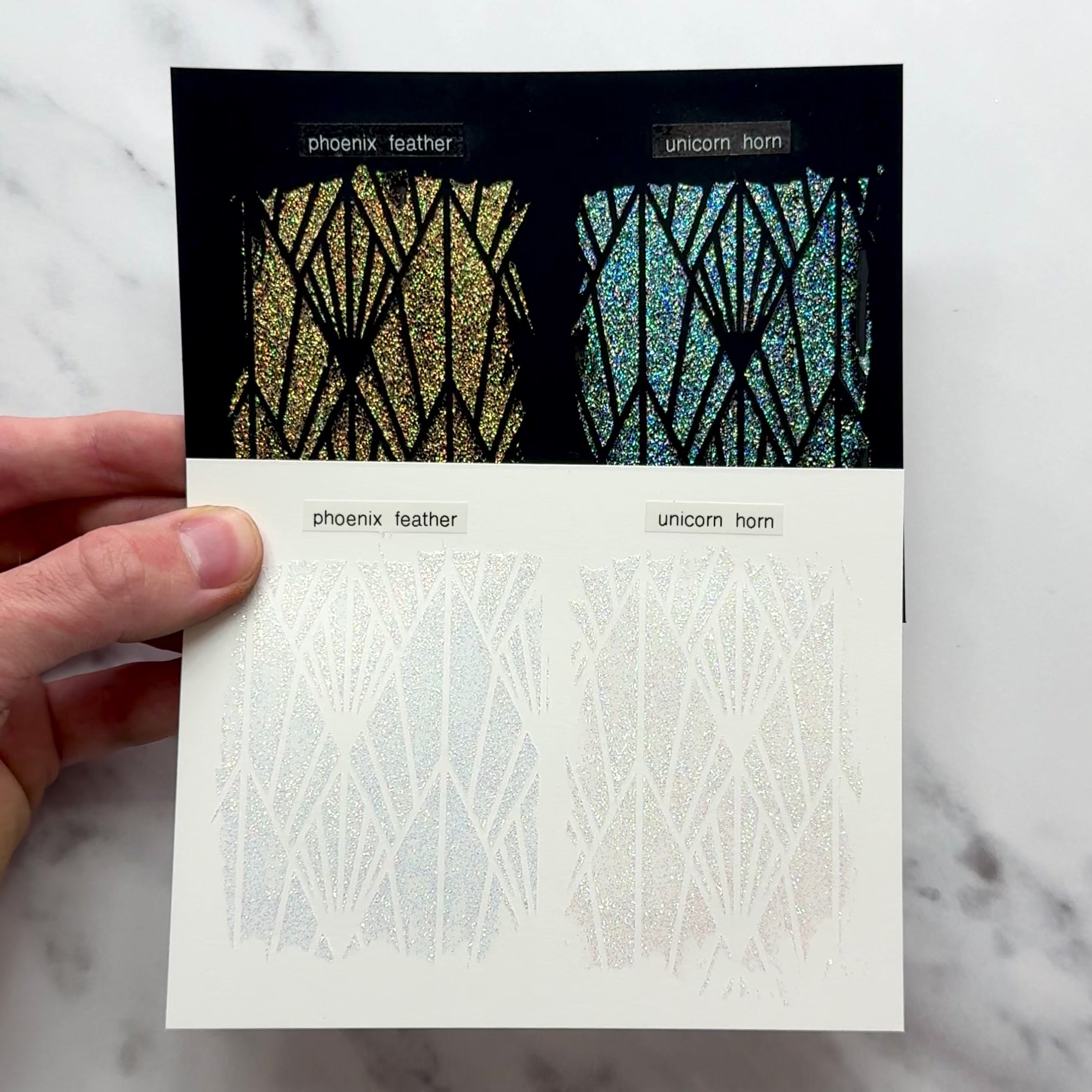 The Ranger Simon Hurley Unicorn Horn and Phoenix Feather Astro Paste Bundle features two unique holographic glitter pastes by Simon Hurley Create. The Unicorn Horn paste offers cool-toned translucent shimmer, while the Phoenix Feather paste delivers warm-toned holographic sparkle. Both can be applied through stencils with a palette knife for crisp texture or spread thinly for a radiant glitter effect. Each set includes two 2 fl. oz. jars and complements the complete Simon Hurley Create color collection.