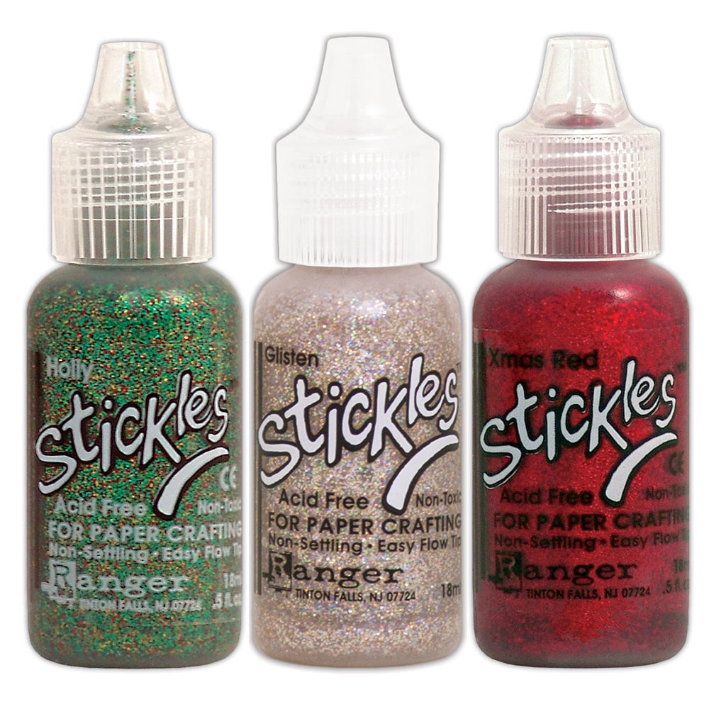Enhance your arts and crafts with Ranger Stickles Glitter Glue Christmas Trio. Perfect for adding sparkle and dimension, this glitter glue is ideal for embellishing cards, stamped images, mixed media art, home décor projects, and more. The easy flow tip allows for precise application and quick creation of sparkling accents. Available in a range of colors, each 0.5oz (14.7ml) bottle is a must-have for any crafting collection.