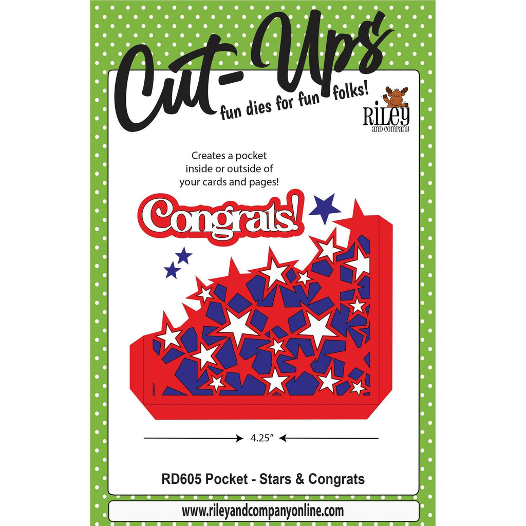 The Riley and Company Cut Ups Pocket Stars and Congrats Dies are made from high-quality metal and can be used in most die-cutting machines. This die features a fun patriotic star-themed corner as well as the word Congrats!