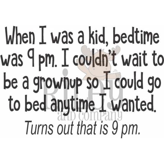 Sentiment Reads: When I was a kid, bedtime was 9 pm. I couldn't wait to be a grownup so I could go to bed anytime I wanted. Turnes out that is 9 pm.