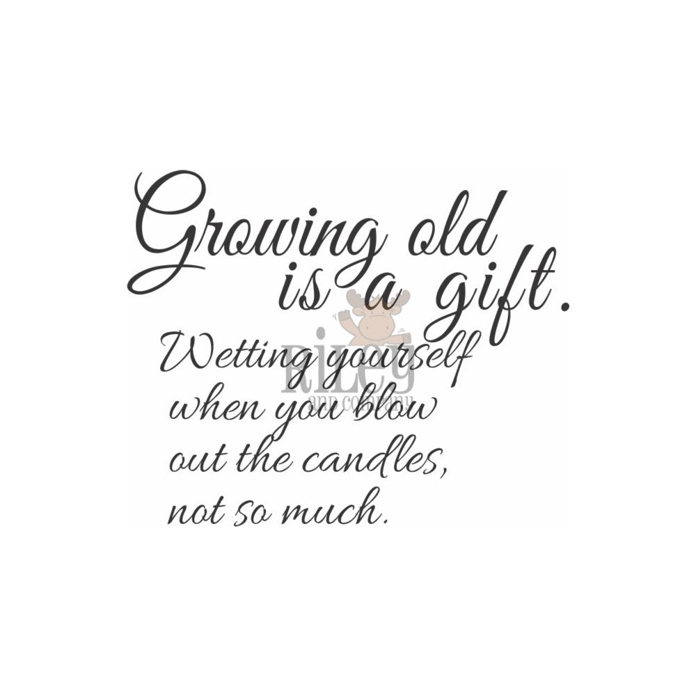It measures approximately 2.25 x 2 inches and features the sentiment Growing old is a gift. Wetting yourself when you blow out the candles not so much. Proudly made in the USA, this stamp is a hilarious way to celebrate aging and poke some fun at the challenges that come with it. Let Funny Bones help you add some snark and humor to your next project!