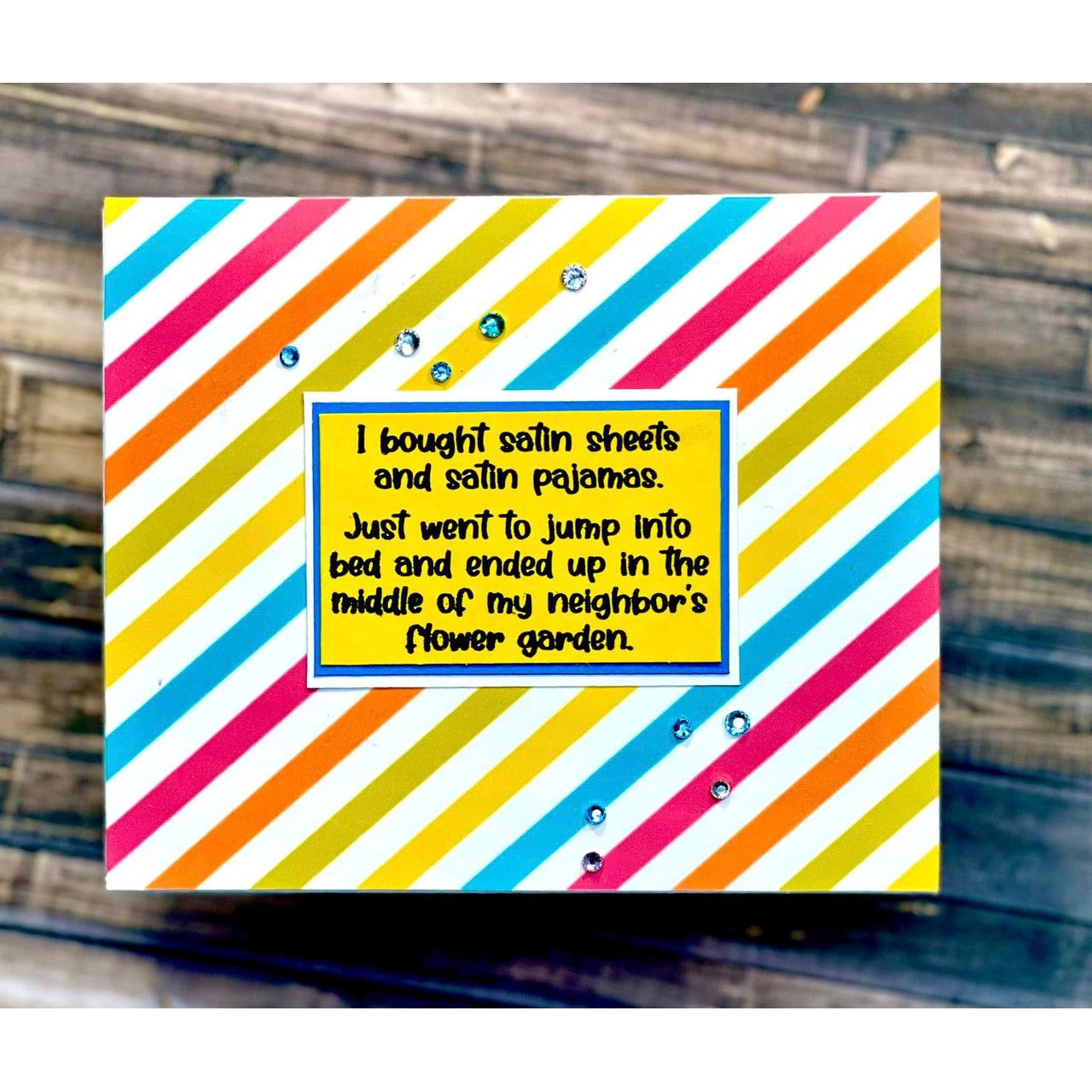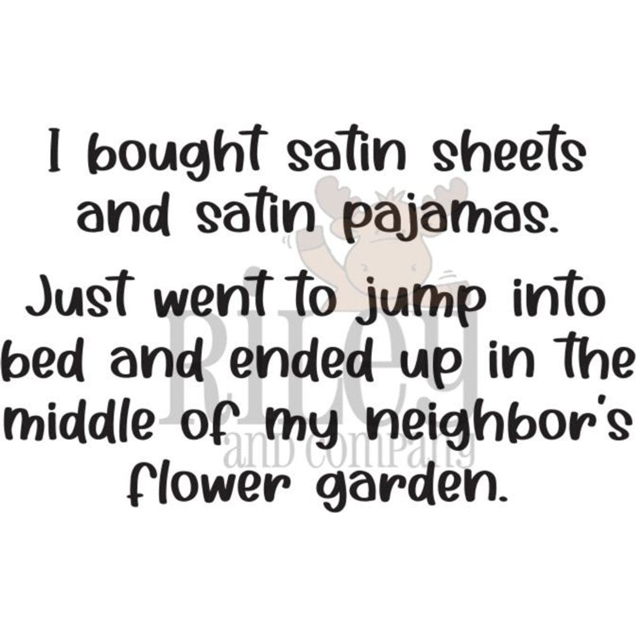 Sentiment reads: I bought satin sheets and satin pajamas. Just went to jump into bed and ended up in the middle of my neighbor's flower garden.