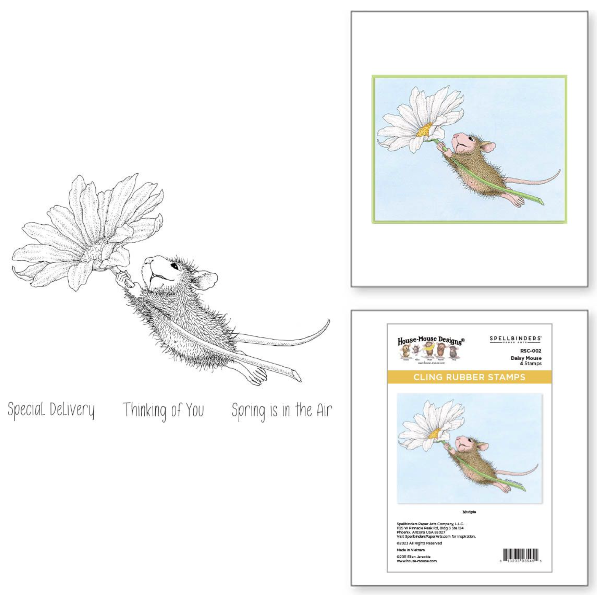 The Daisy Mouse Cling Rubber Stamps are part of the Spring Collection by House-Mouse Designs, featuring a set of four stamps. The largest stamp showcases Mudpie, the mouse, holding a single daisy flower. Additionally, the set includes three sentiments for users to choose from. These stamps are designed to be used with an acrylic block.