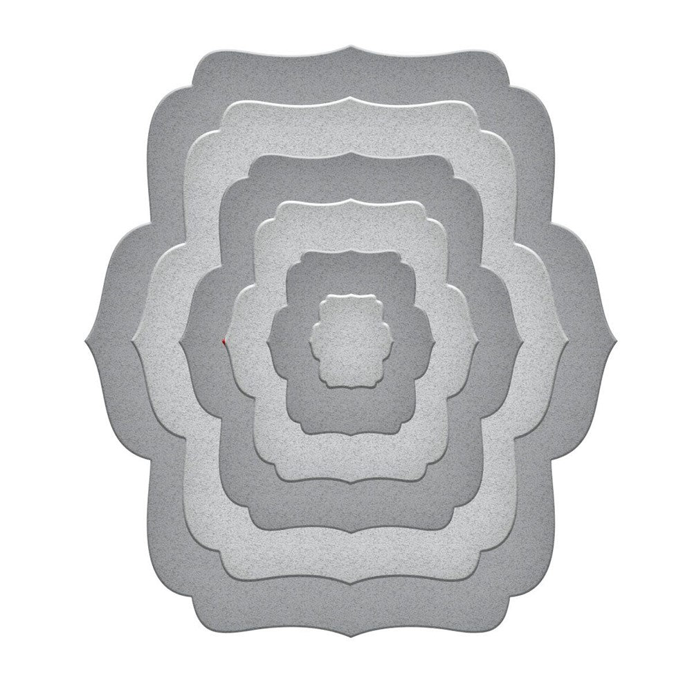 The Labels 5 Etched Dies is a set of scalloped, oval shaped Nestabilities labels from Spellbinders. The set features rounded corners and smooth curves, perfect for creating shaped cards, scrapbook journaling blocks, and altered frames. The dies cut, emboss, and stencil with a single die template, making them ideal for scrapbook pages, cards, and mixed media projects.