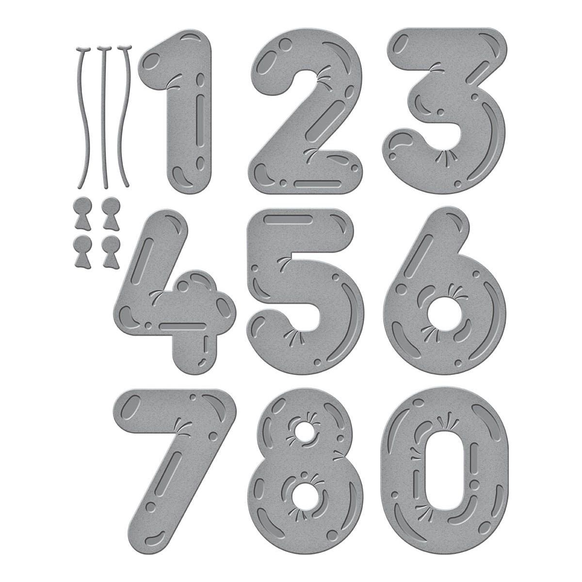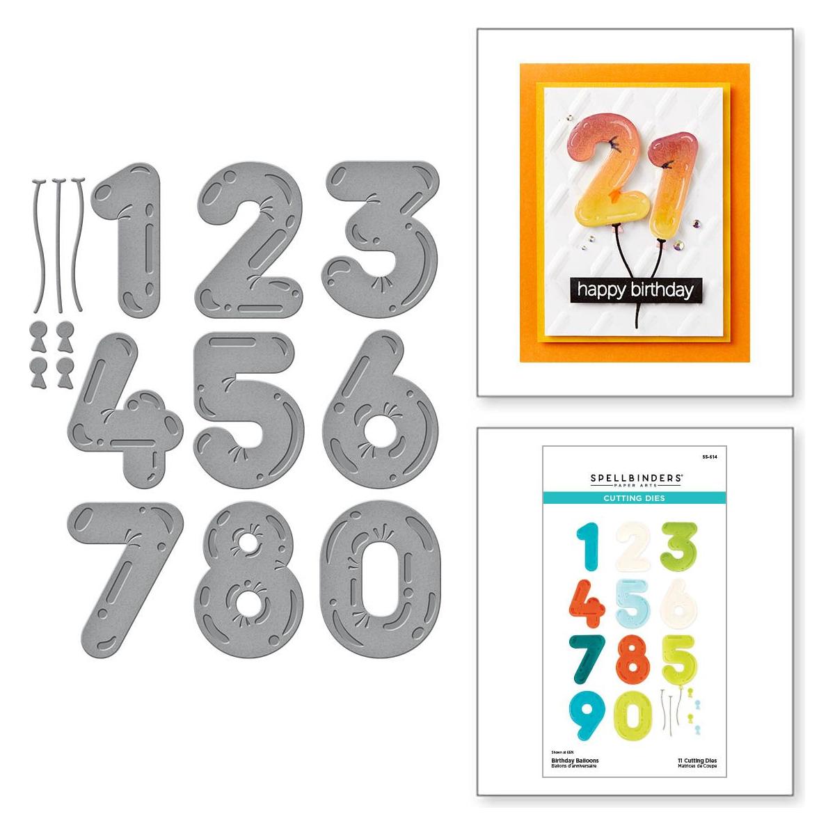 The Spellbinders Birthday Balloons Etched Dies, part of the Monster Birthday Collection, offer a delightful assortment of numbered balloons perfect for celebrating milestone occasions like anniversaries, graduations, and more. This set includes 11 thin metal cutting dies that allow you to create complete balloons, from the number to the knot to the string, adding a fun and festive touch to your crafting projects.