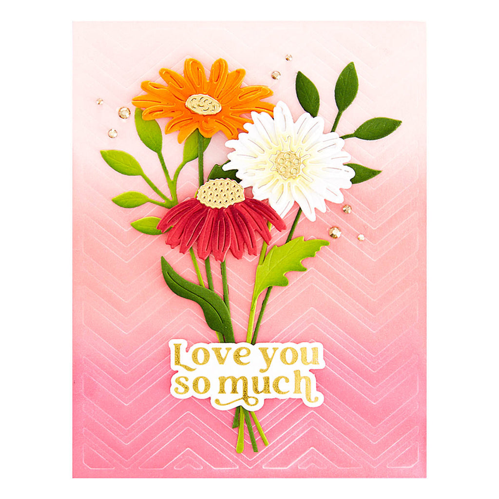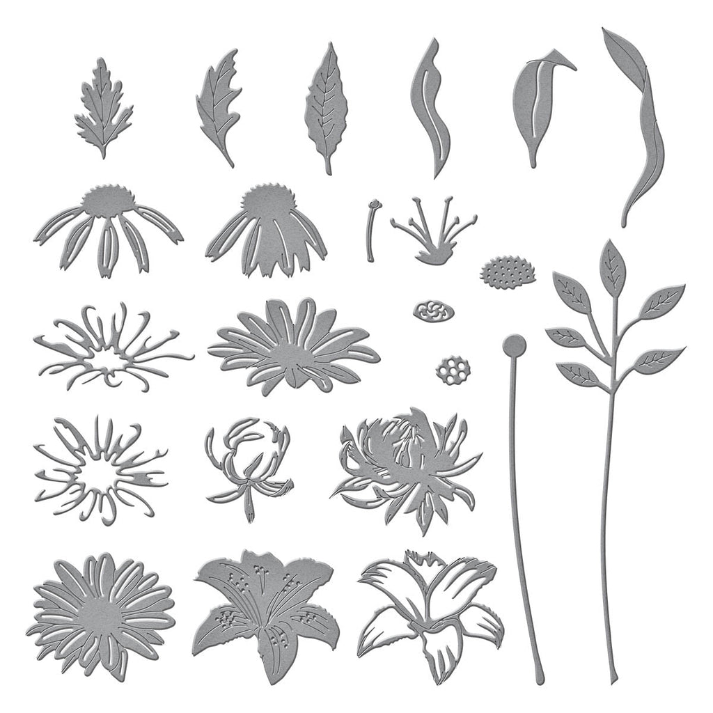 Introducing the Floral Stems Etched Dies from the Photosynthesis Collection by Simon Hurley. These thin metal cutting dies offer a versatile selection of 23 dies, allowing you to create various types of blooms including cone flowers, mums, daisies, and lilies.