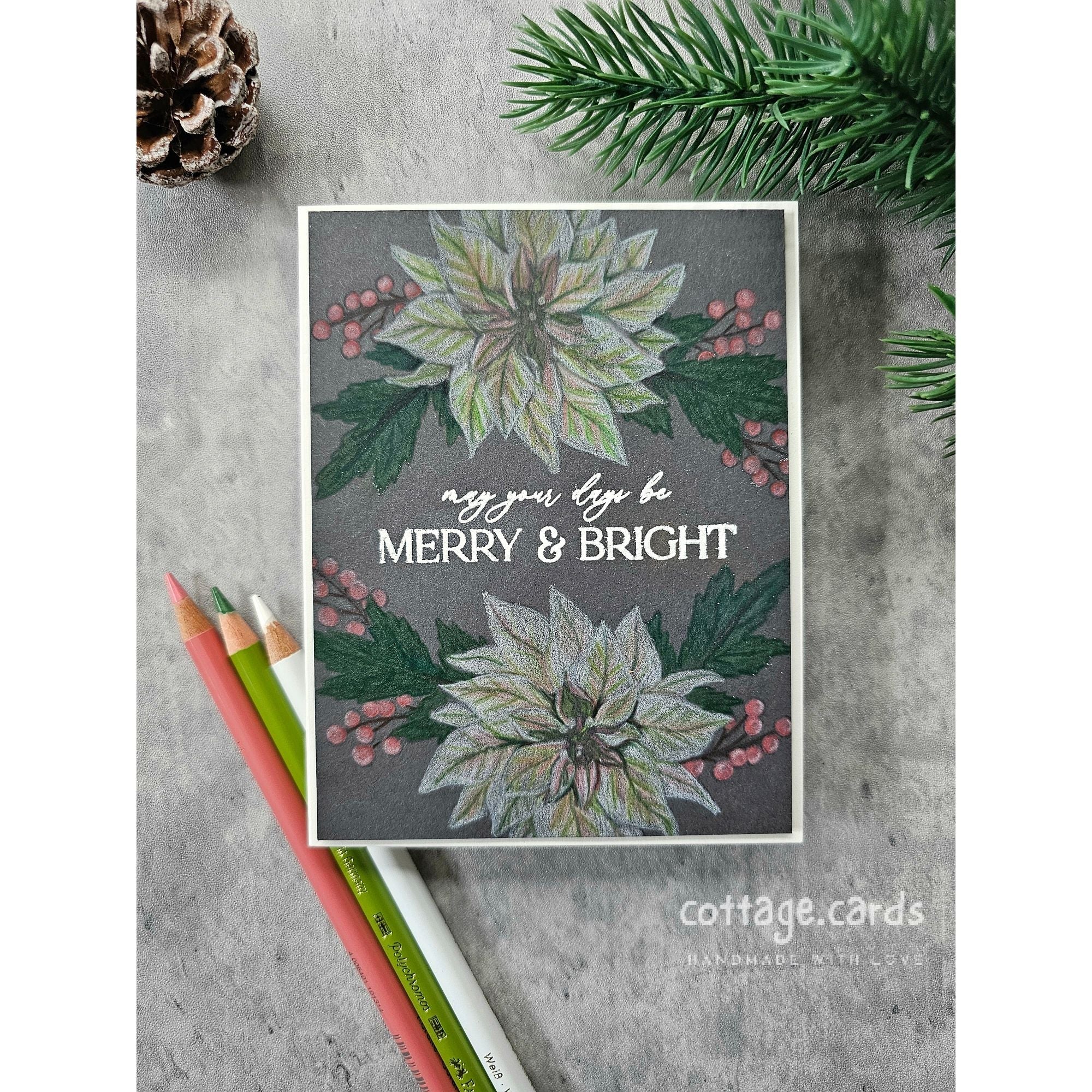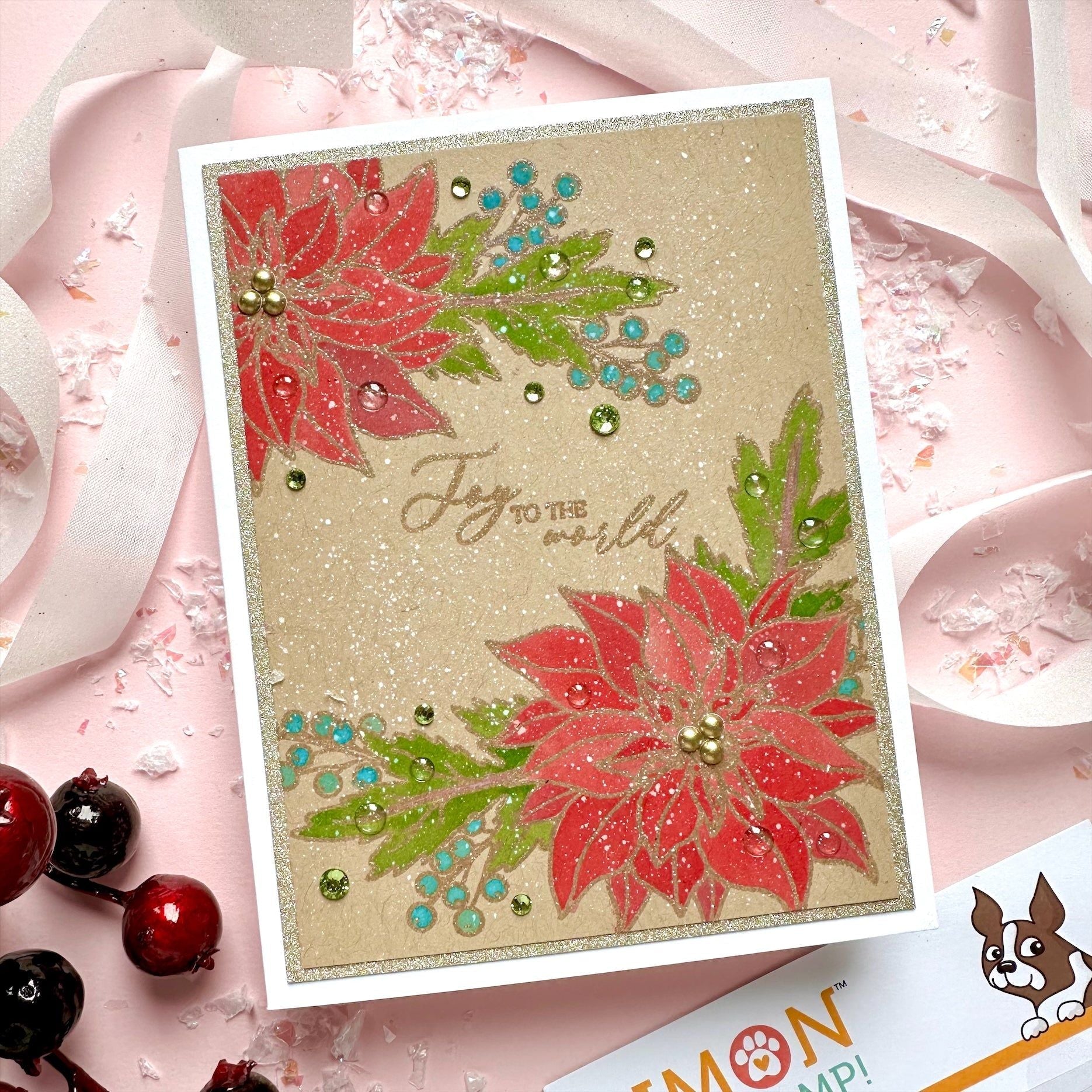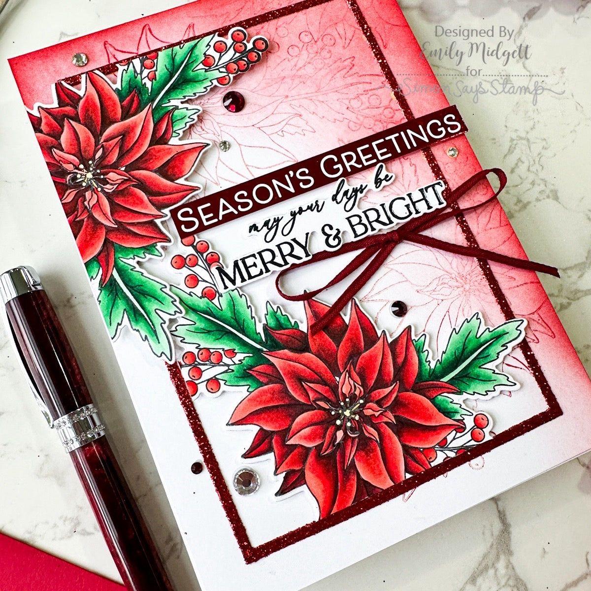 The Simon Says Stamp Poinsettia Swag stamp set offers a beautiful, festive focal point for your holiday crafting projects. The main image features an elegant poinsettia surrounded by delicate greenery and berries, perfect for adding a touch of seasonal cheer to cards, gift tags, and more.