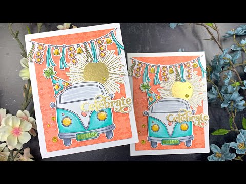 The Simon Says Stamp Boho Party stamp set boasts an eclectic array of design elements. With images ranging from a party hat to a stylized sun, balloons, a charming floral border, a tassel garland, and even a nostalgic VW-style bus, it provides an extensive palette of creative options.