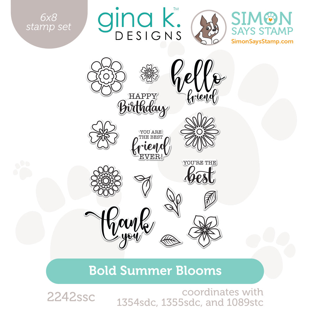 The Gina K Designs Bold Summer Blooms stamp set is a Simon Says Stamp exclusive, available only at SimonSaysStamp.com. This modern floral set features a collection of bold, mix-and-match flower and leaf images designed to create striking layered arrangements.