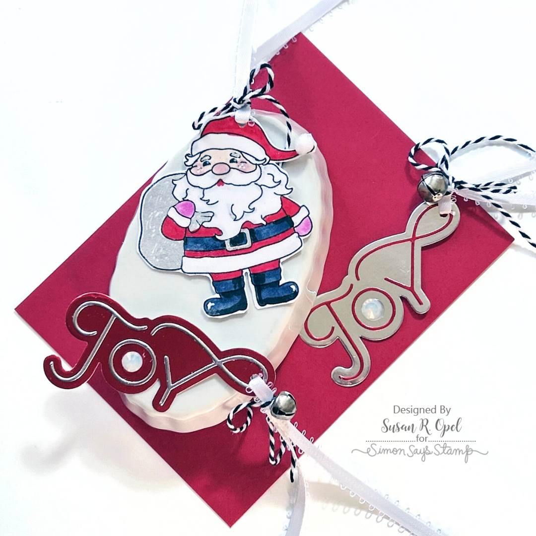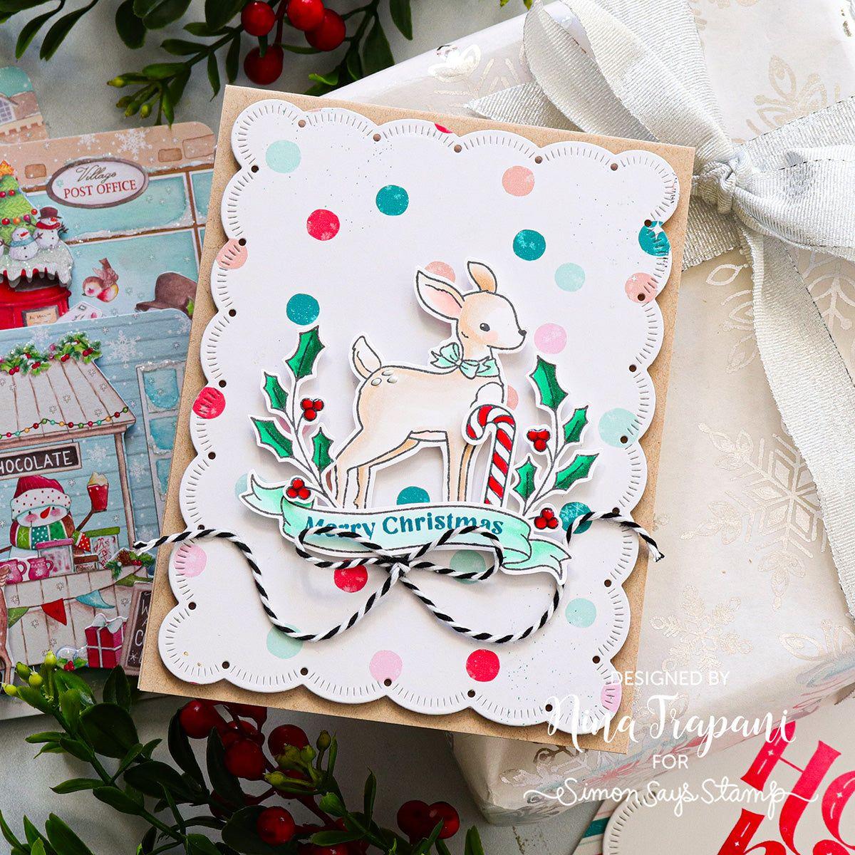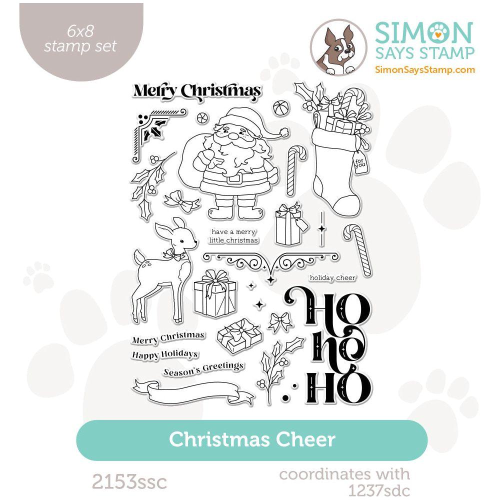 The Simon Says Stamp Christmas Cheer stamp set is perfect for adding festive charm to your holiday projects. It features delightful illustrations of Santa Claus, a deer, presents, a stocking full of gifts, candy, greenery, bows, and ornamental corners and lines.