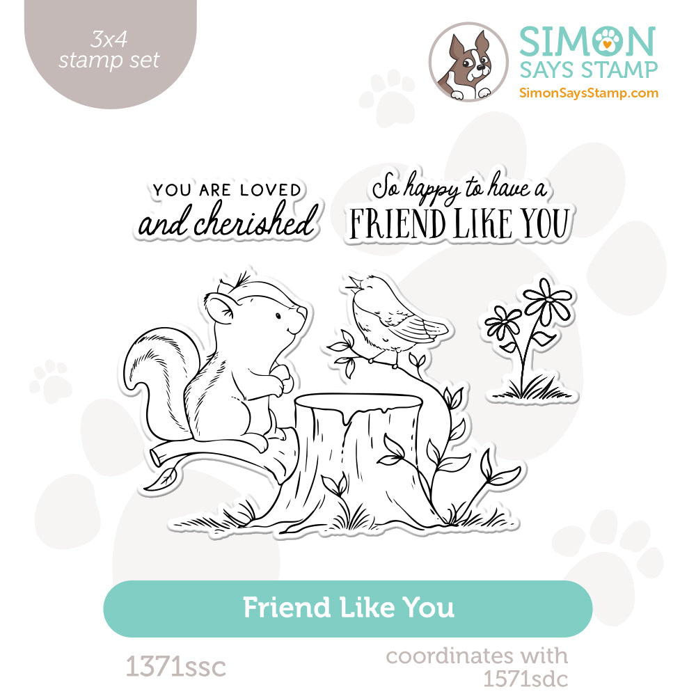 The Simon Says Stamp Friend Like You stamp set features a sweet woodland scene of a chipmunk and a bird interacting around a sprouting tree stump.