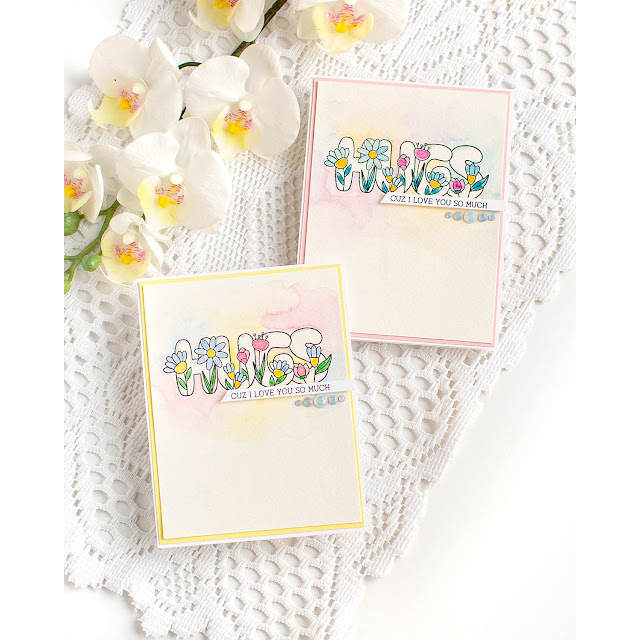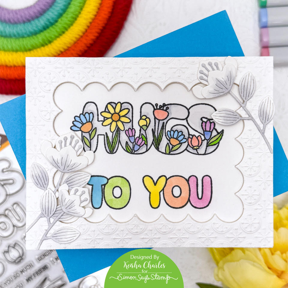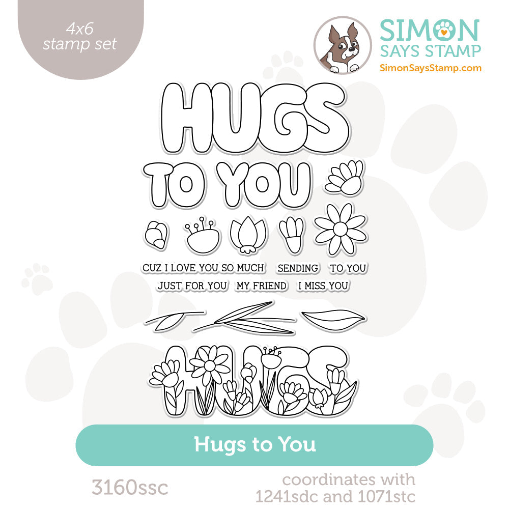 The Simon Says Stamp Hugs to You stamp set is an appealing combination of happy flowers and puffy, nostalgic lettering. There are open letters for you to color or decorate as you please, blooms and leaves, and a "Hugs" sentiment adorned with various flowers.