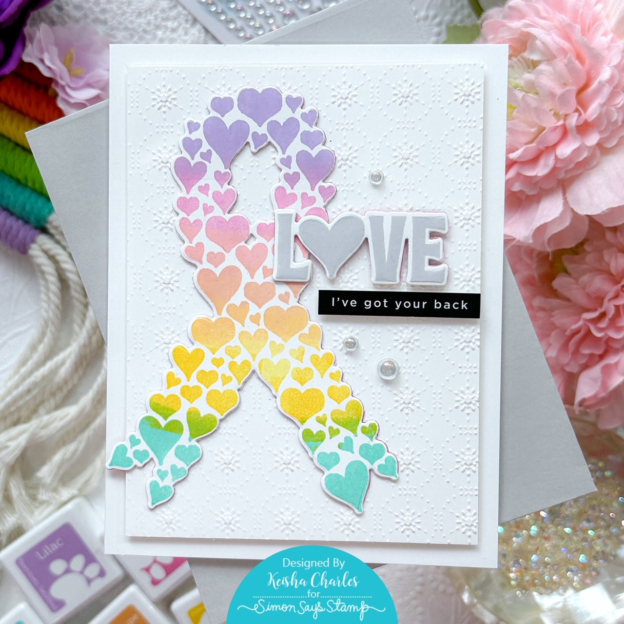 Introducing the Simon Says Stamp Love Ribbon stamp set—a heartfelt collection designed to spread awareness and love. This set includes both large and small awareness ribbons adorned with delicate heart patterns, allowing you to show your support and affection for those who are suffering with cancer or other diseases in a creative way.
