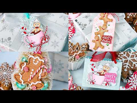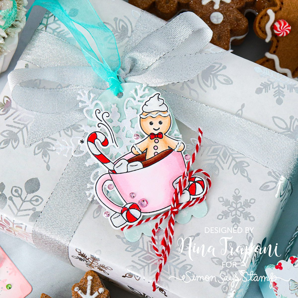 The Simon Says Stamp Merry and Sweet stamp set captures the cozy essence of the holiday season with its delightful image of a steaming cup of hot cocoa topped with marshmallows, a candy cane, and an adorable gingerbread man.