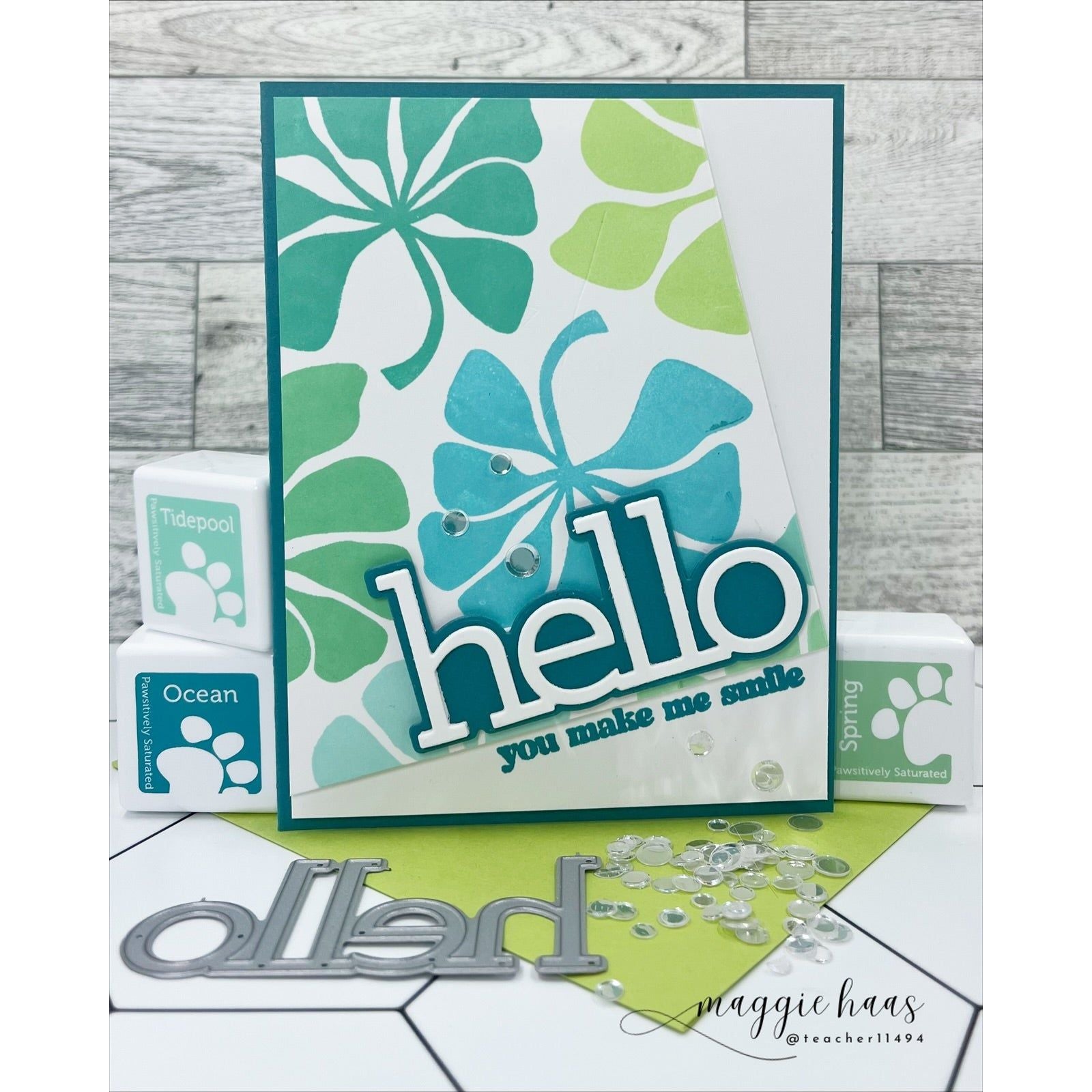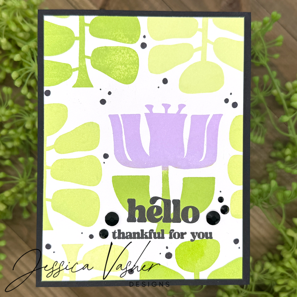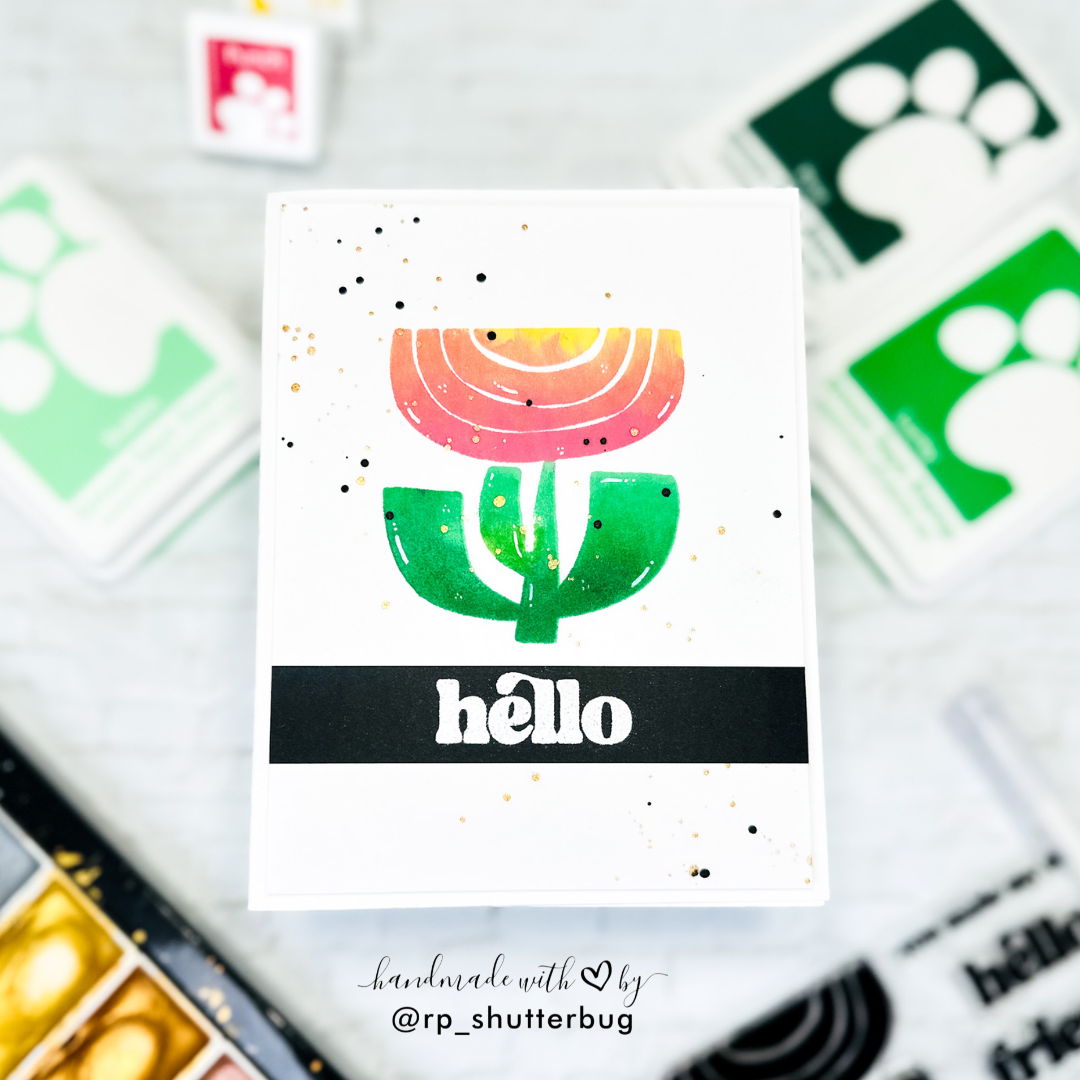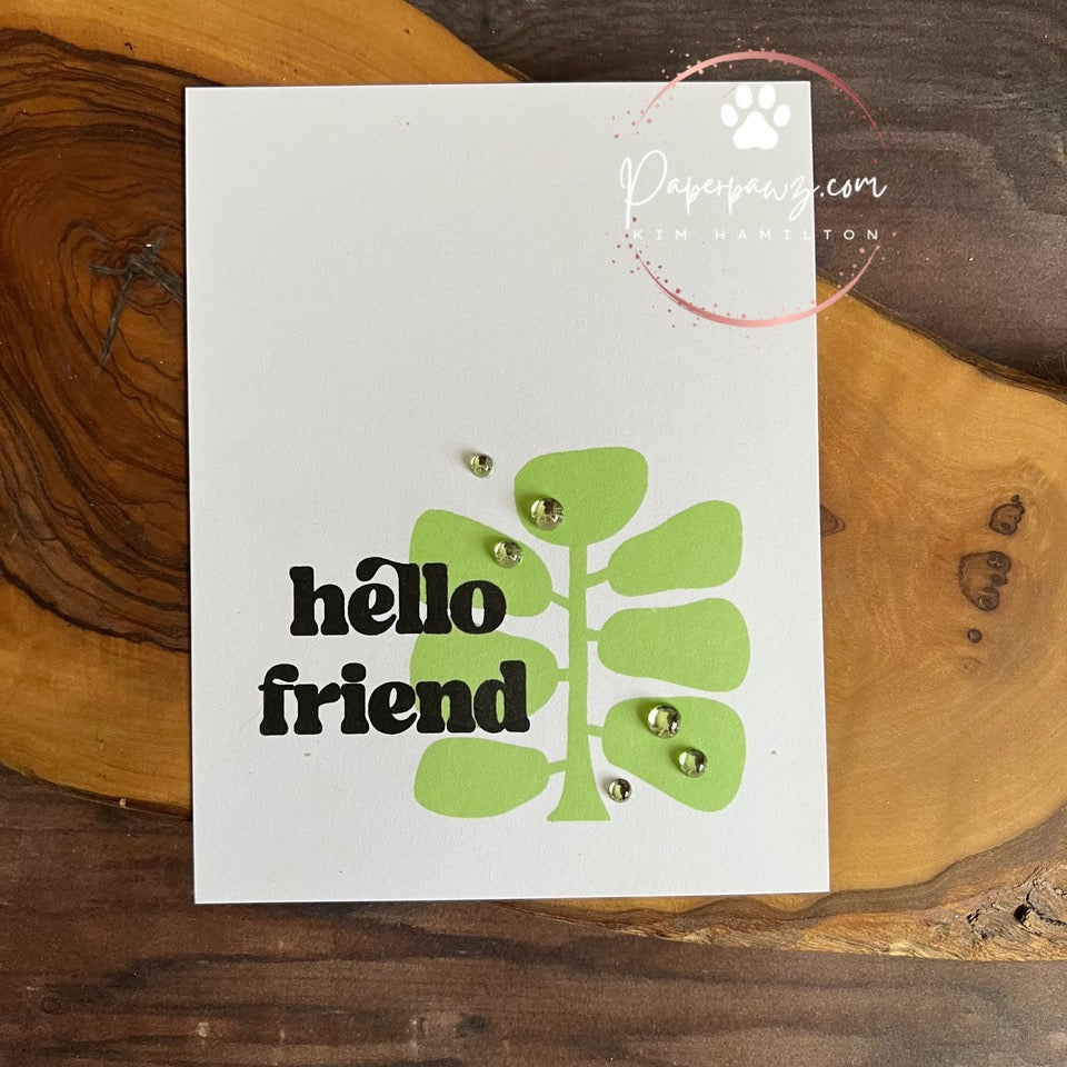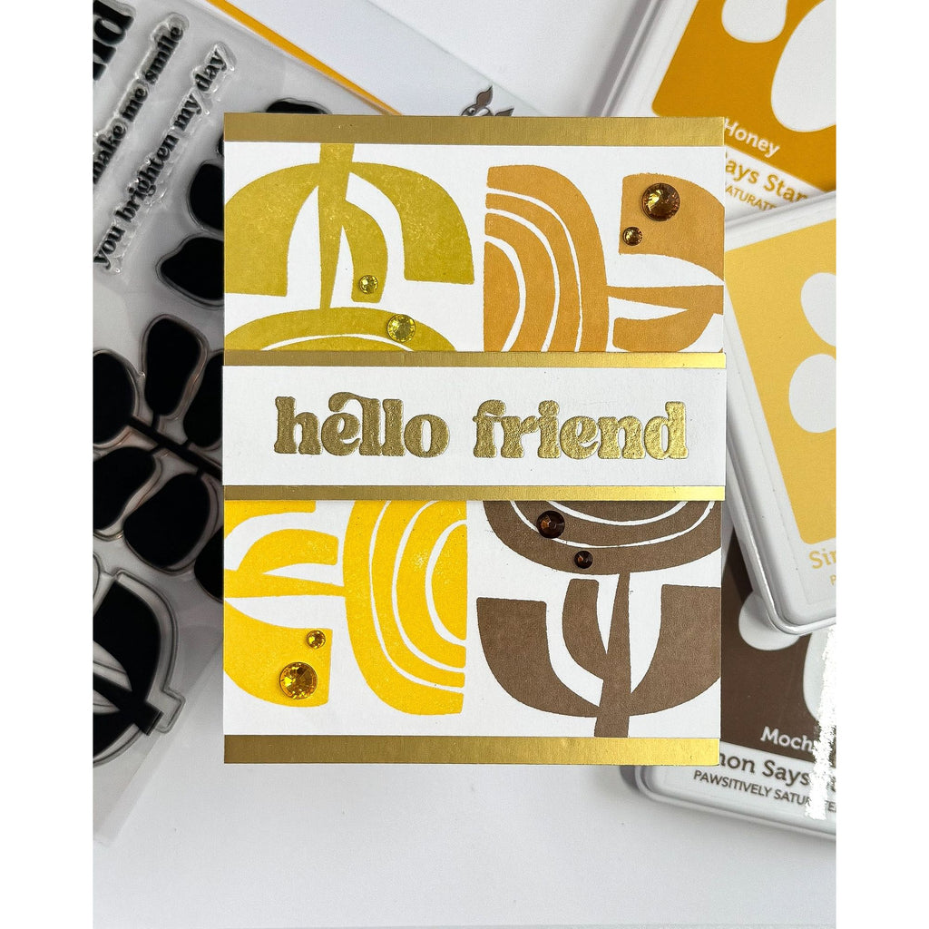 Complementing the contemporary imagery are bold sentiments in a matching mod font, including the two larger greetings, "hello" and "friend," along with four versatile sub-sentiments to mix and match.