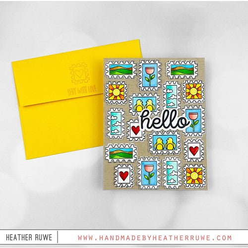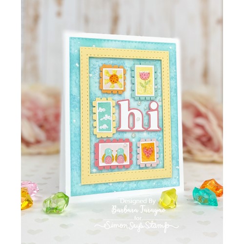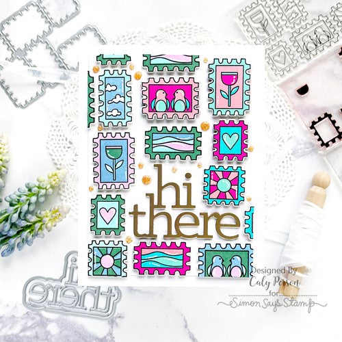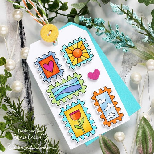 This cheerful 6x8 inch clear layering stamp set allows you to customize your own color schemes and add the perfect sentiments to send happiness to your loved ones! These stamps, which create postage stamp images of birds, clouds, hearts, flowers, hills, and sunshine. Simon Says Stamp clear stamps are high-quality photopolymer and made in the USA.