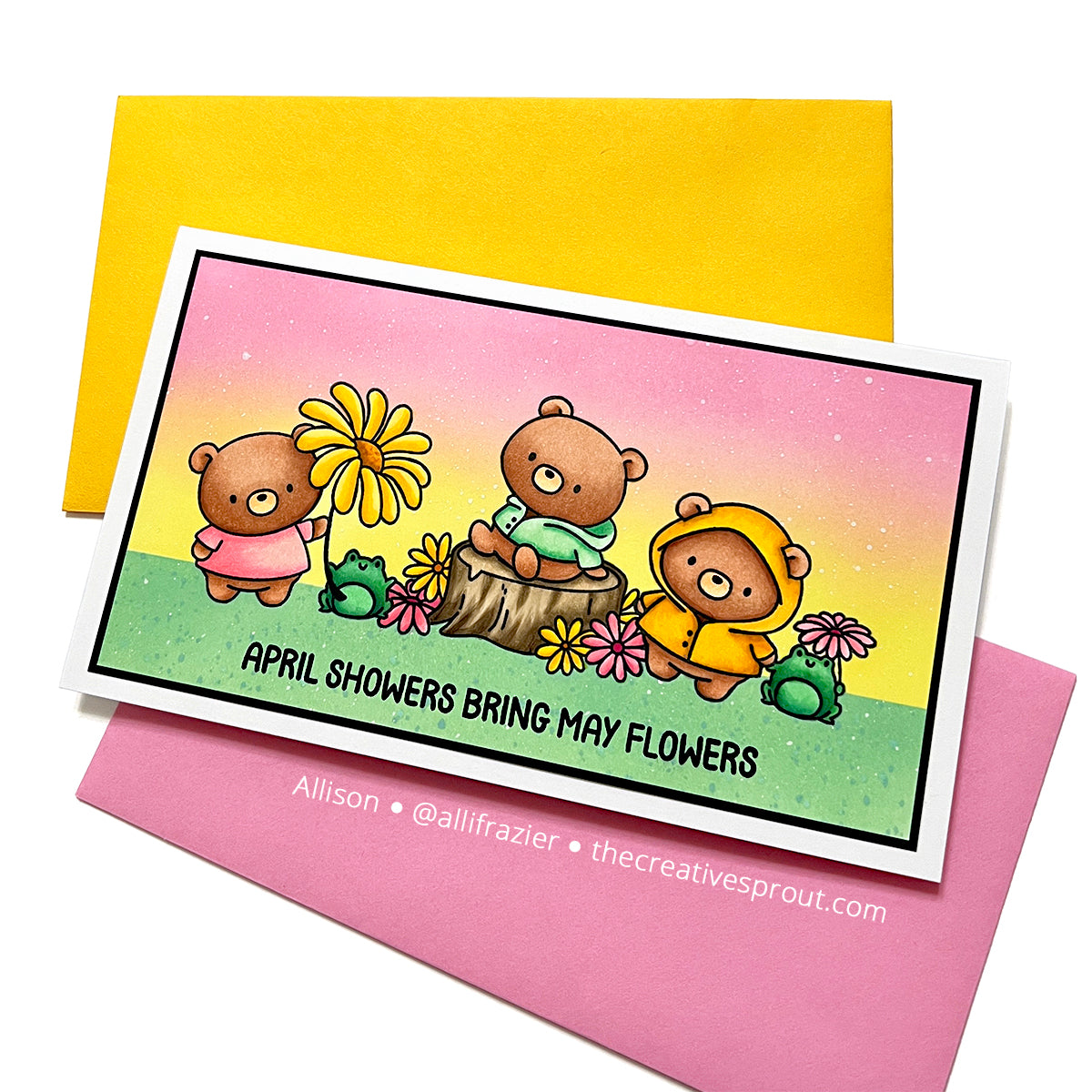 The Simon Says Stamp Rain or Shine stamp set is bursting with springtime charm, featuring adorable bears and their playful little frog companions. This versatile set allows you to create delightful scenes with mix-and-match elements, including umbrellas, puddles, flowers, and even a cozy tree stump for the critters to perch on. Whether you're crafting a rainy-day adventure or a cheerful springtime moment, the possibilities are endless!