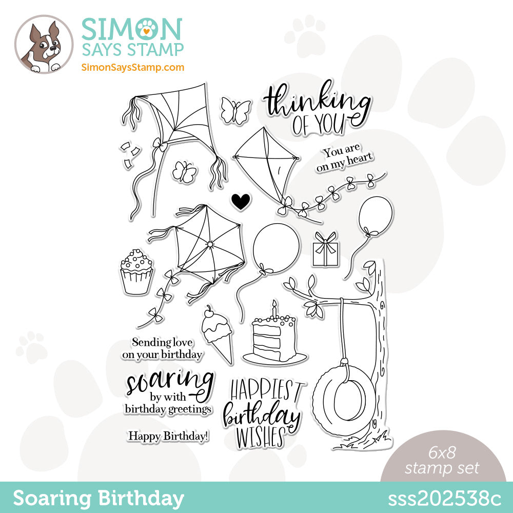 Simon Says Stamp clear stamps are high quality photopolymer and made in the USA. This stamp set measures approximately 6 x 8 inches and has a coordinating die set, Soaring Birthday (sssd121633c).