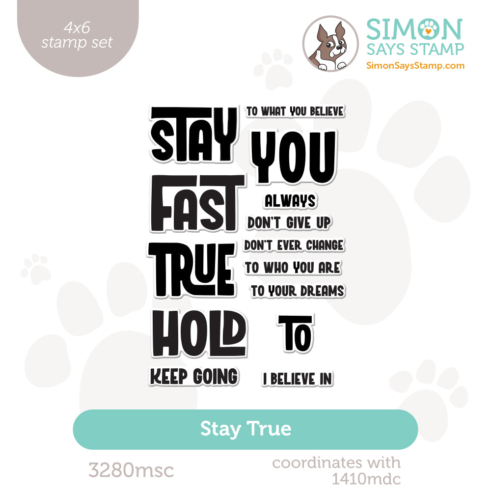 The Simon Says Stamp Stay True stamp set is a sentiment-focused collection featuring encouraging greetings in a bold, modern decorative font. The eye-catching lettering brings a fresh, contemporary style to your projects while sharing uplifting messages.