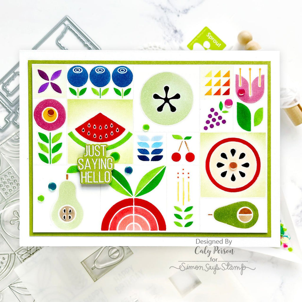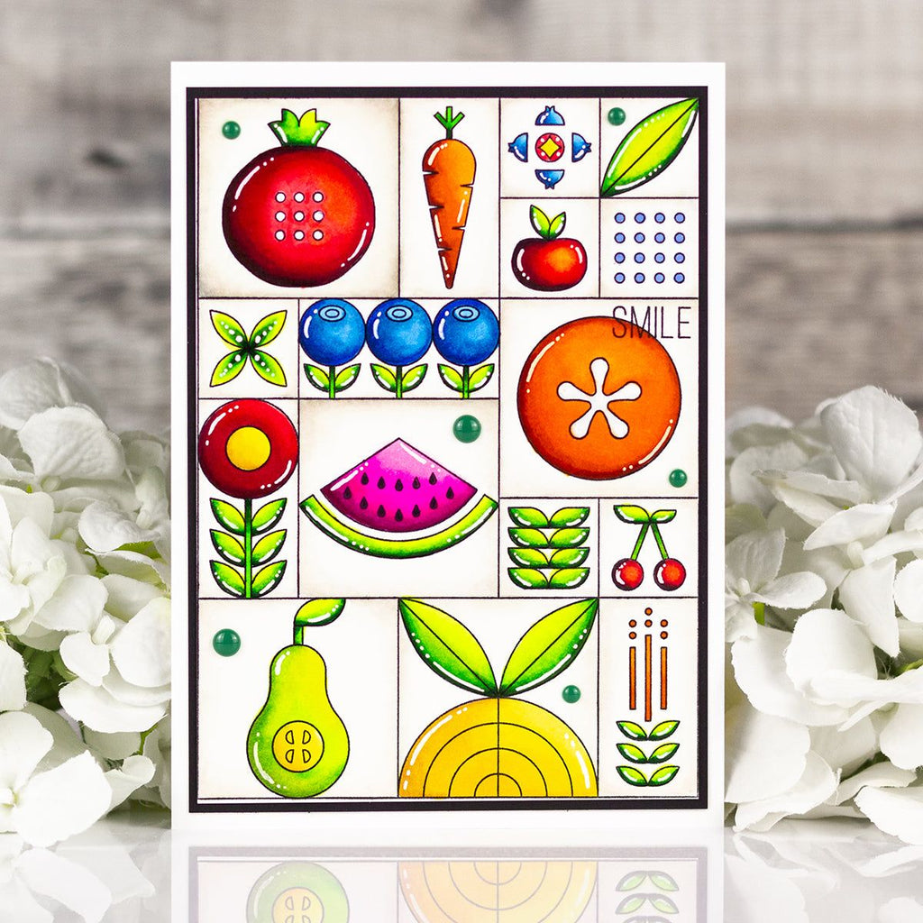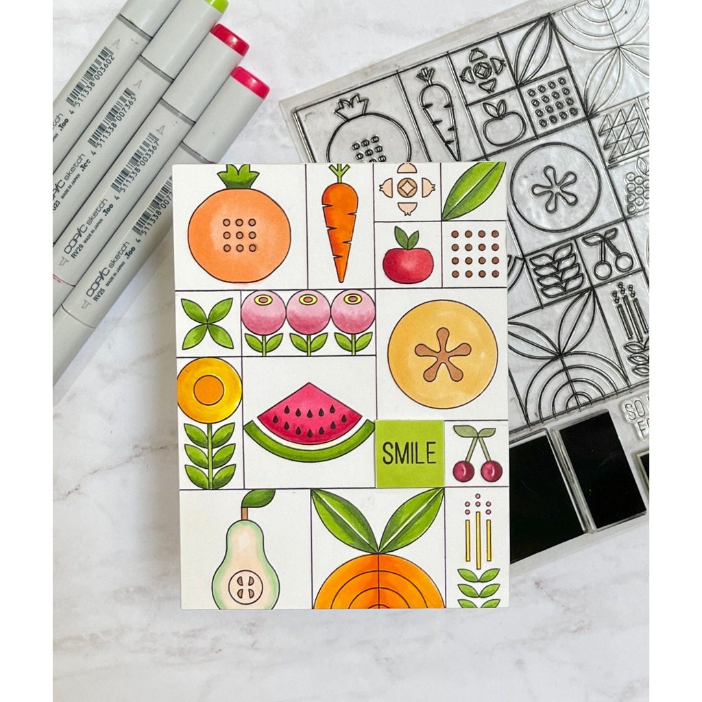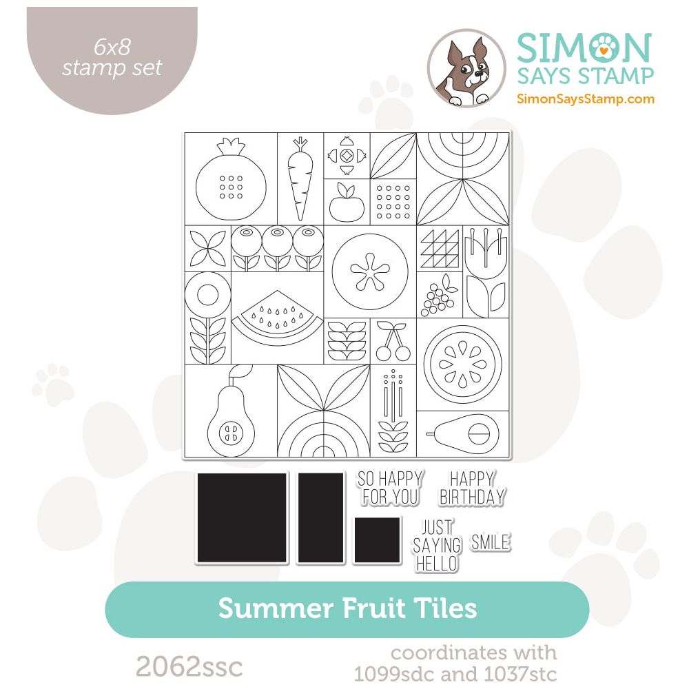 Introducing the Simon Says Stamp Summer Fruit Tiles stamp set! Delight in a vibrant array of modern, stylized fruit, vegetable, and floral images, arranged in a large grid for easy crafting.