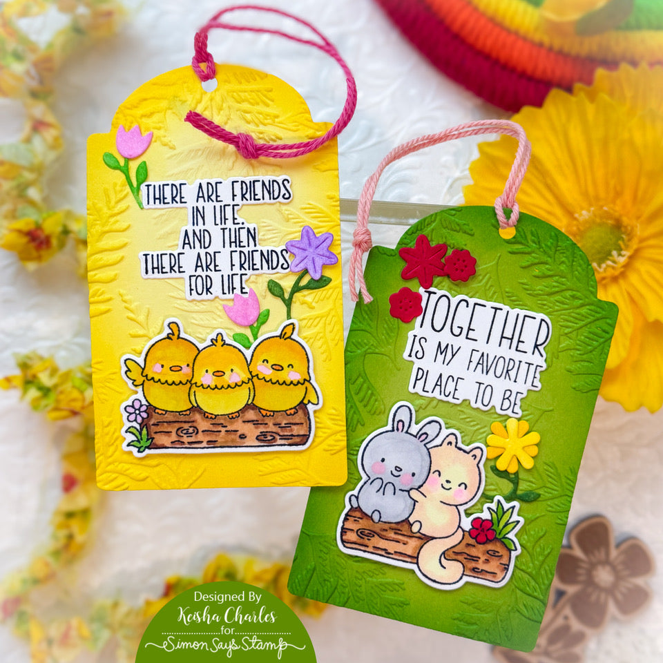The Simon Says Stamp Sweet Friendship stamp set features charming pairs and trios of cute animals perched on logs, including birds, a cat, a bunny, a dog, a squirrel, a fox, and a mouse.