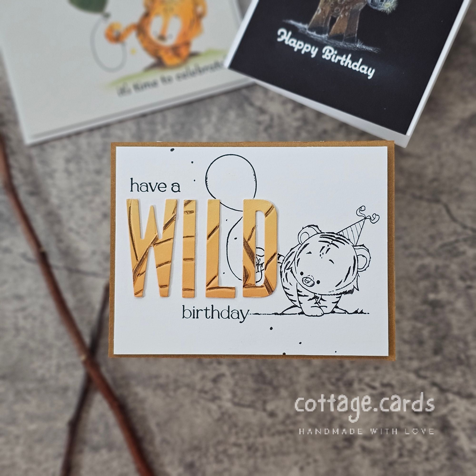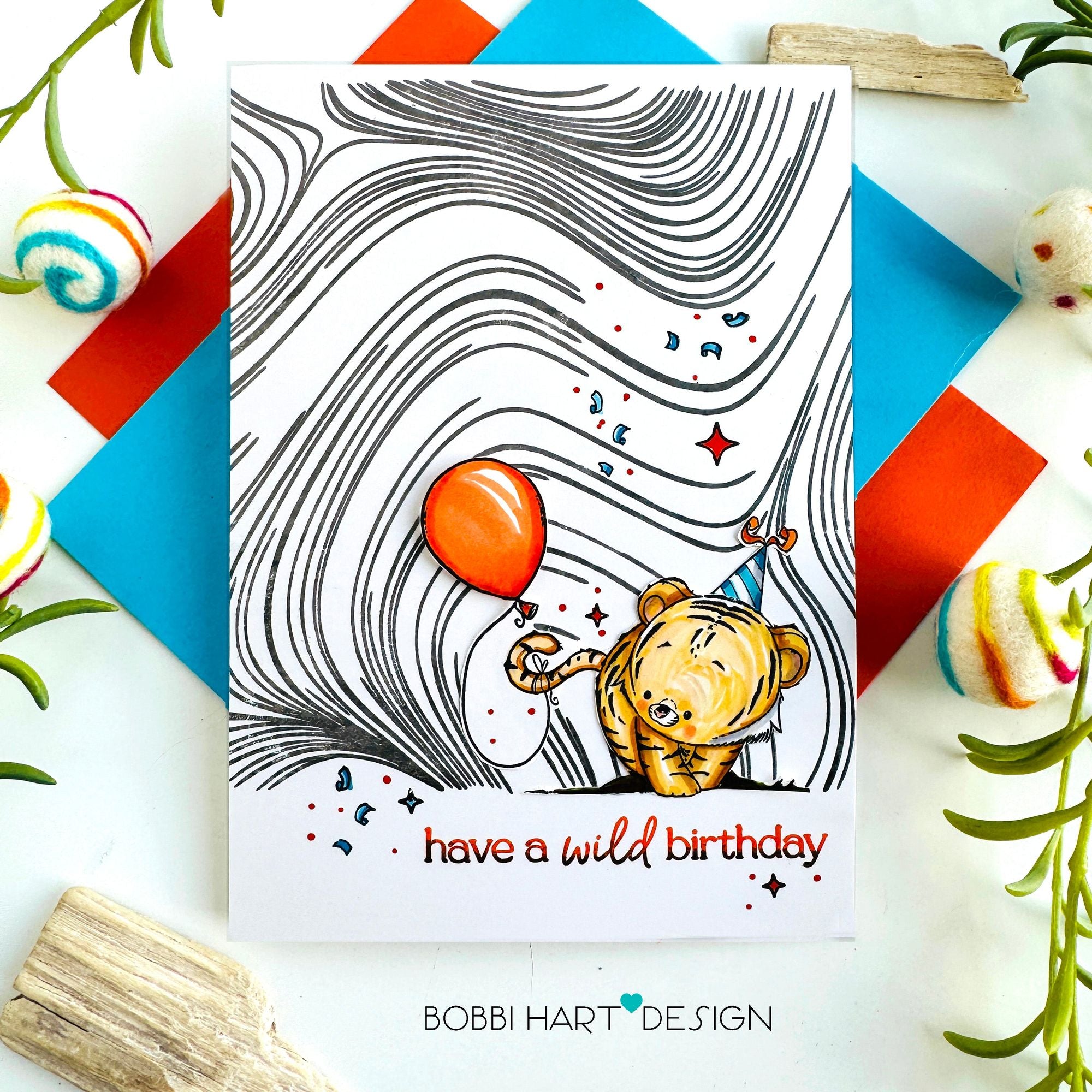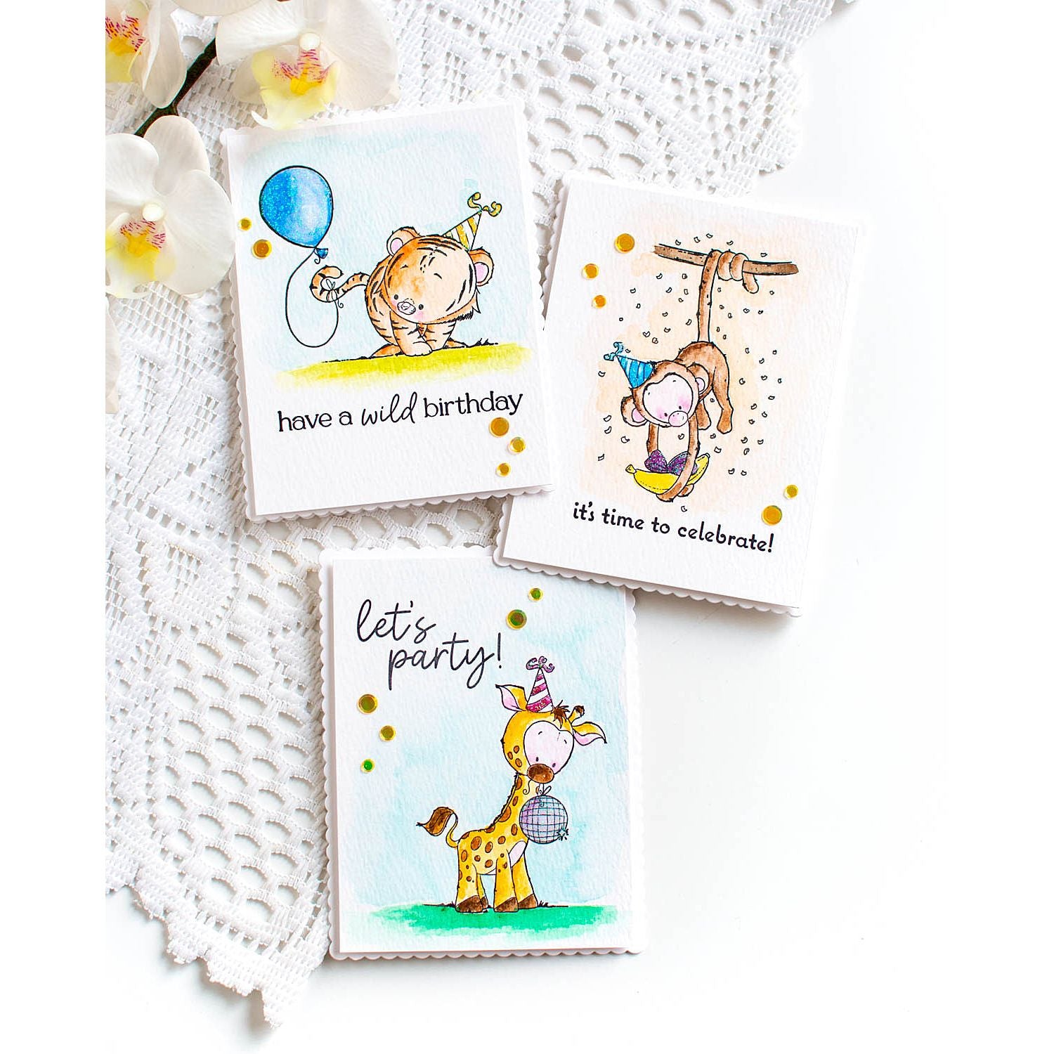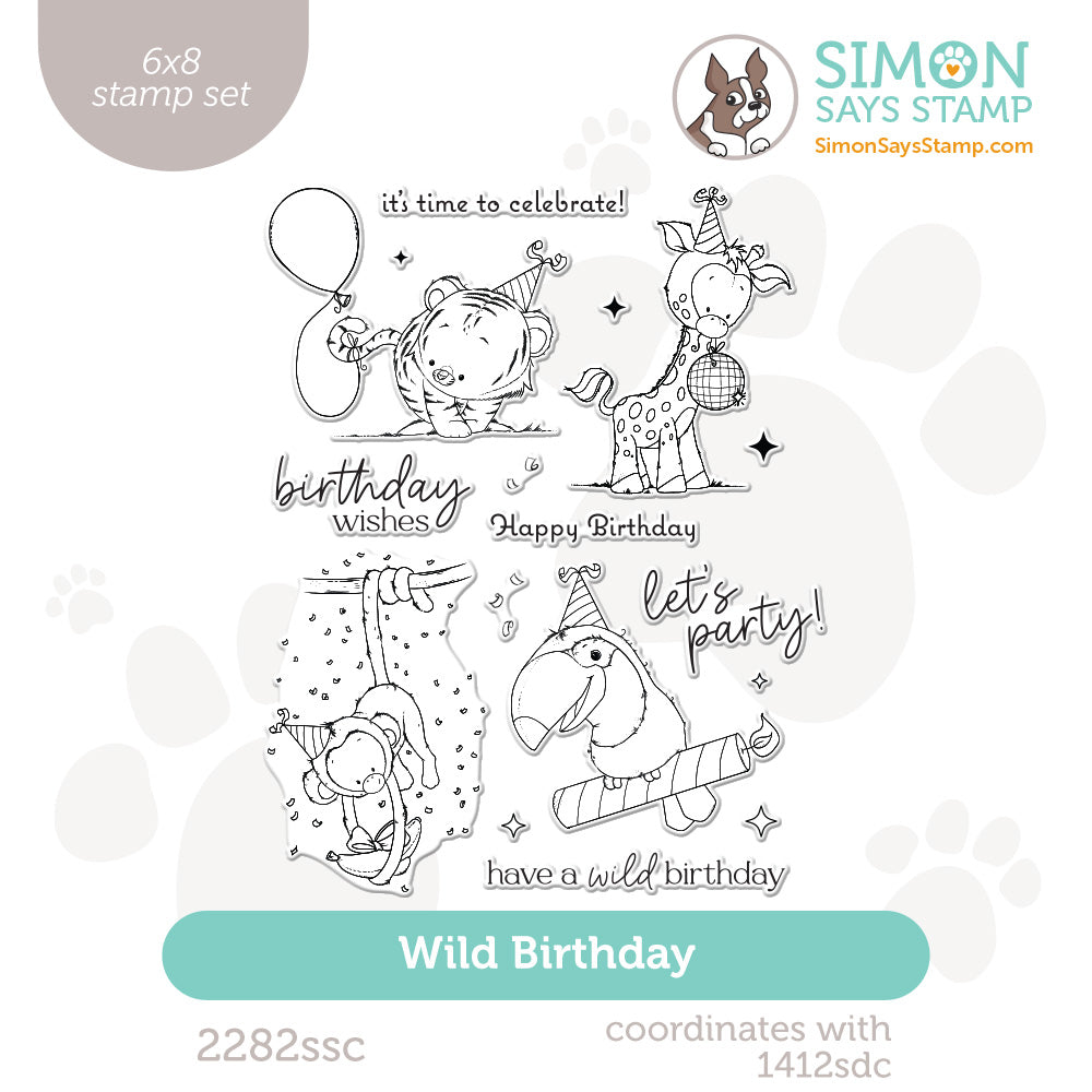 Celebrate in wild style with the Simon Says Stamp Wild Birthday stamp set. This adorable collection features storybook-style jungle animals dressed for the party—a tiger holding a balloon, a giraffe with a disco ball, a monkey presenting a gift, and a toucan perched atop a candle.