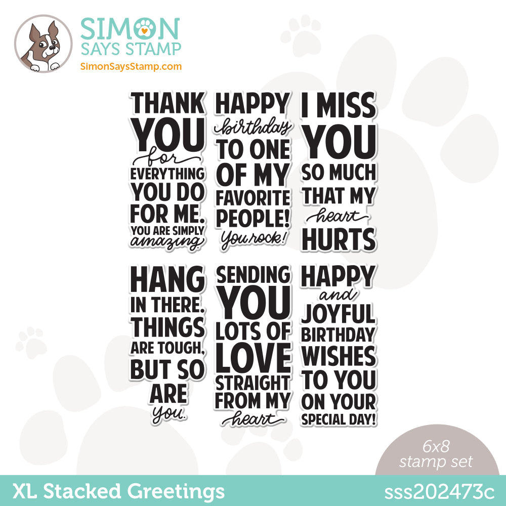 Simon Says Stamp clear stamps are high quality photopolymer and made in the USA. This stamp set measures approximately 6 x 8 inches and has a coordinating die set, XL Stacked Greetings (sssd112569c).