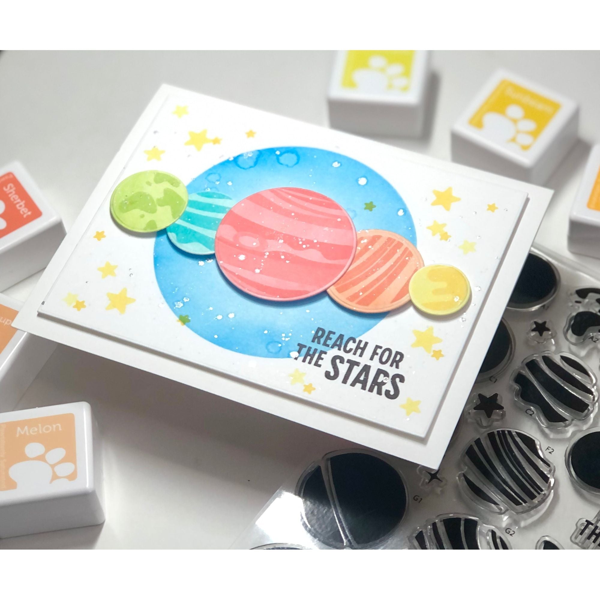 Create a captivating universe of your own by layering the planet stamps using different ink colors. With each layer, your planets will come to life, revealing a mesmerizing combination of colors and textures. Let your creativity soar as you experiment with various color schemes to capture the unique essence of each planet.