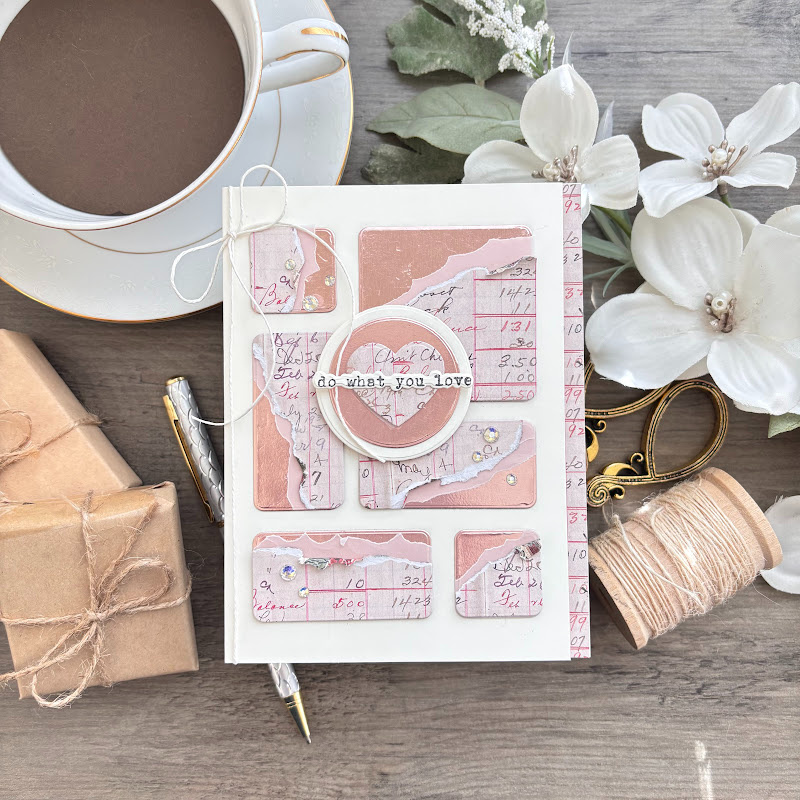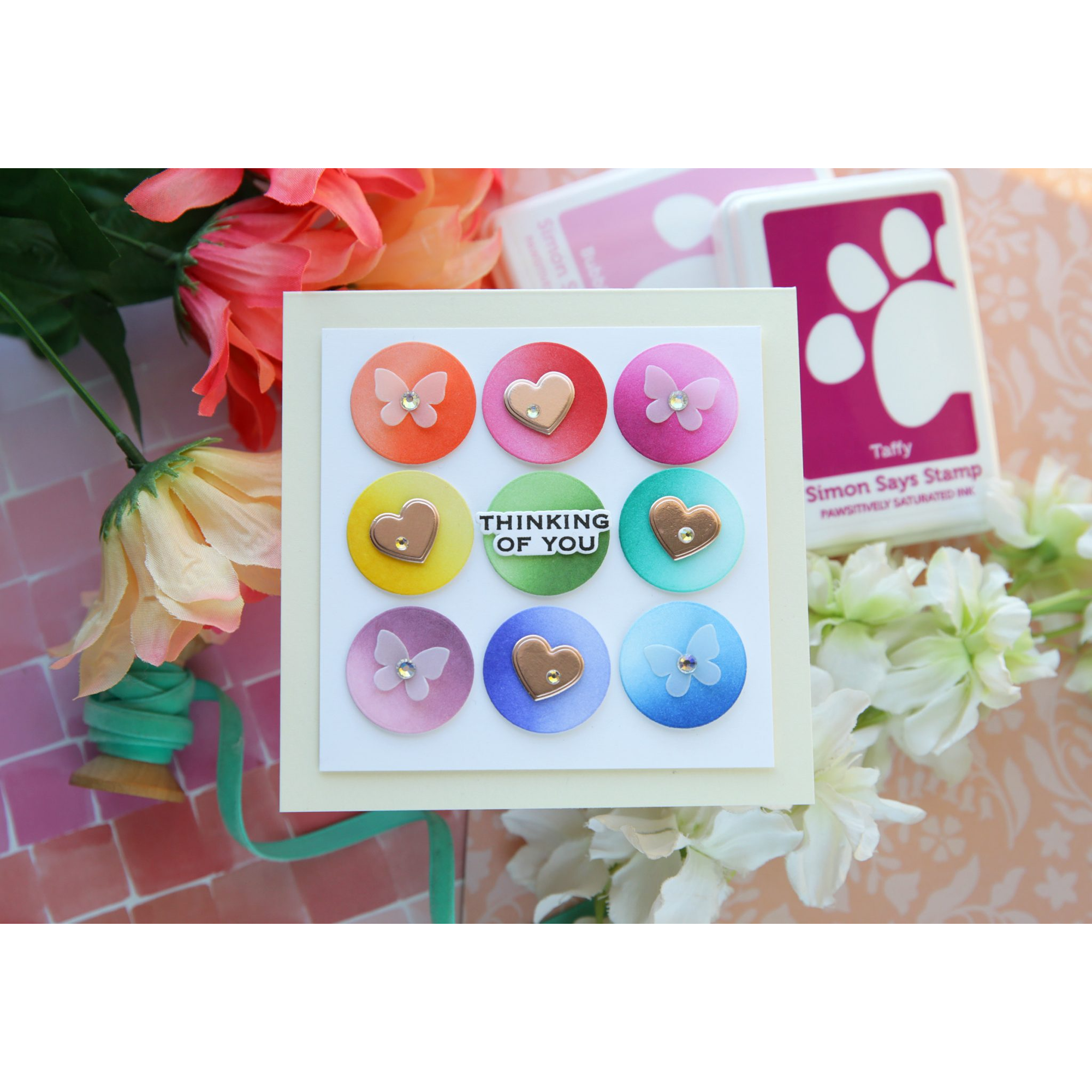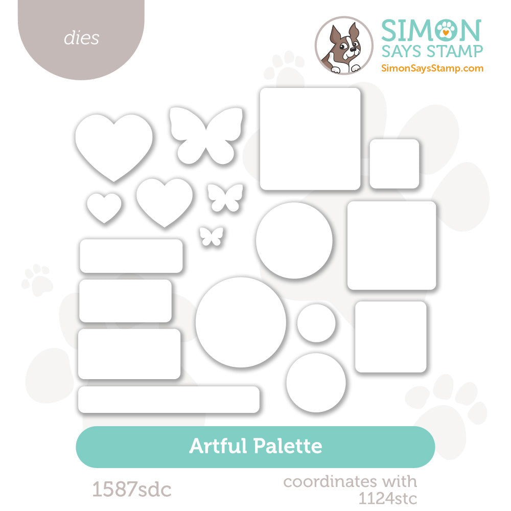 The Simon Says Stamp Artful Palette dies coordinate with the Artful Palette Layering Templates to cut out the rounded rectangles and squares used in those modern layouts. This set also includes additional accent shapes like hearts, circles, and butterflies, giving you even more options for layering and embellishing.