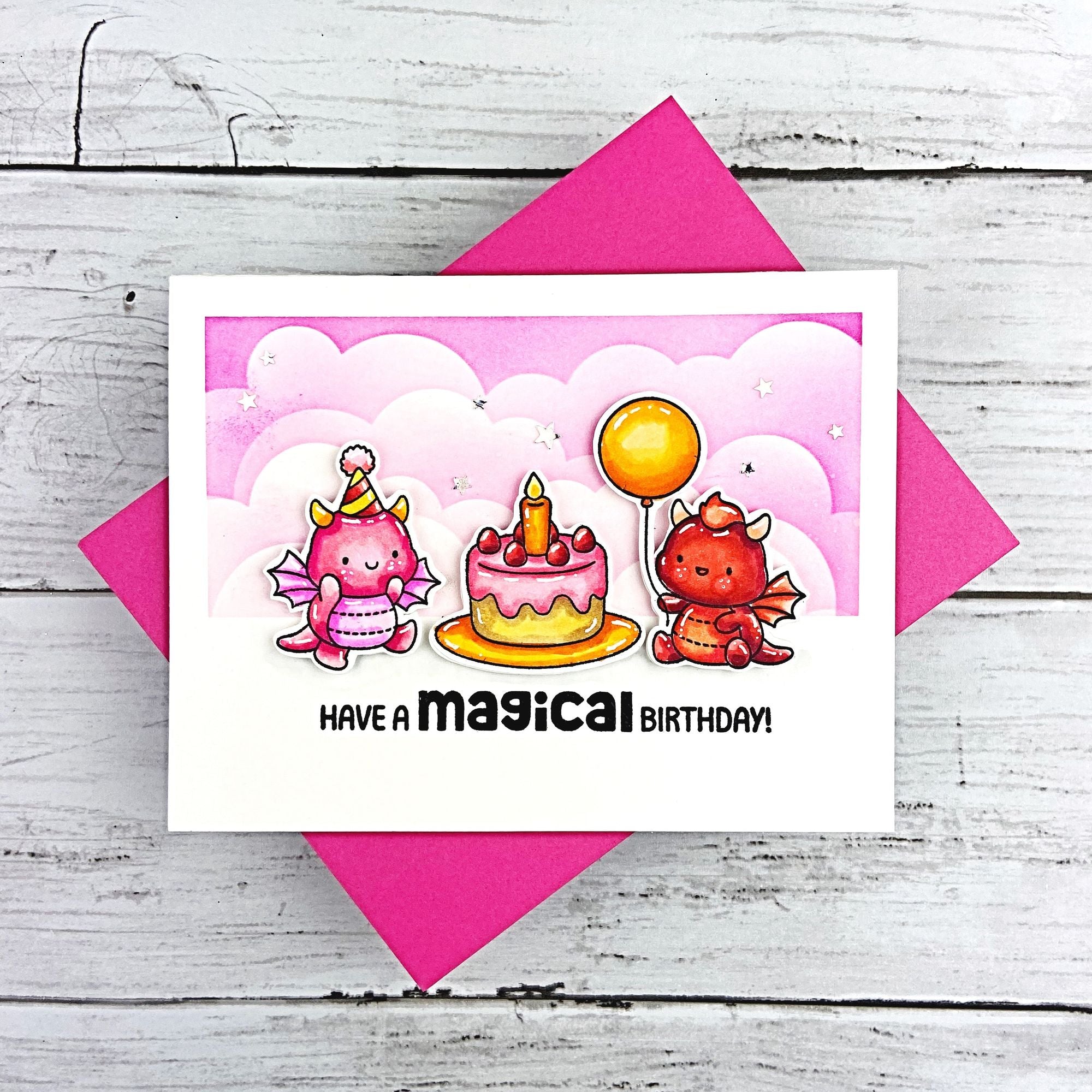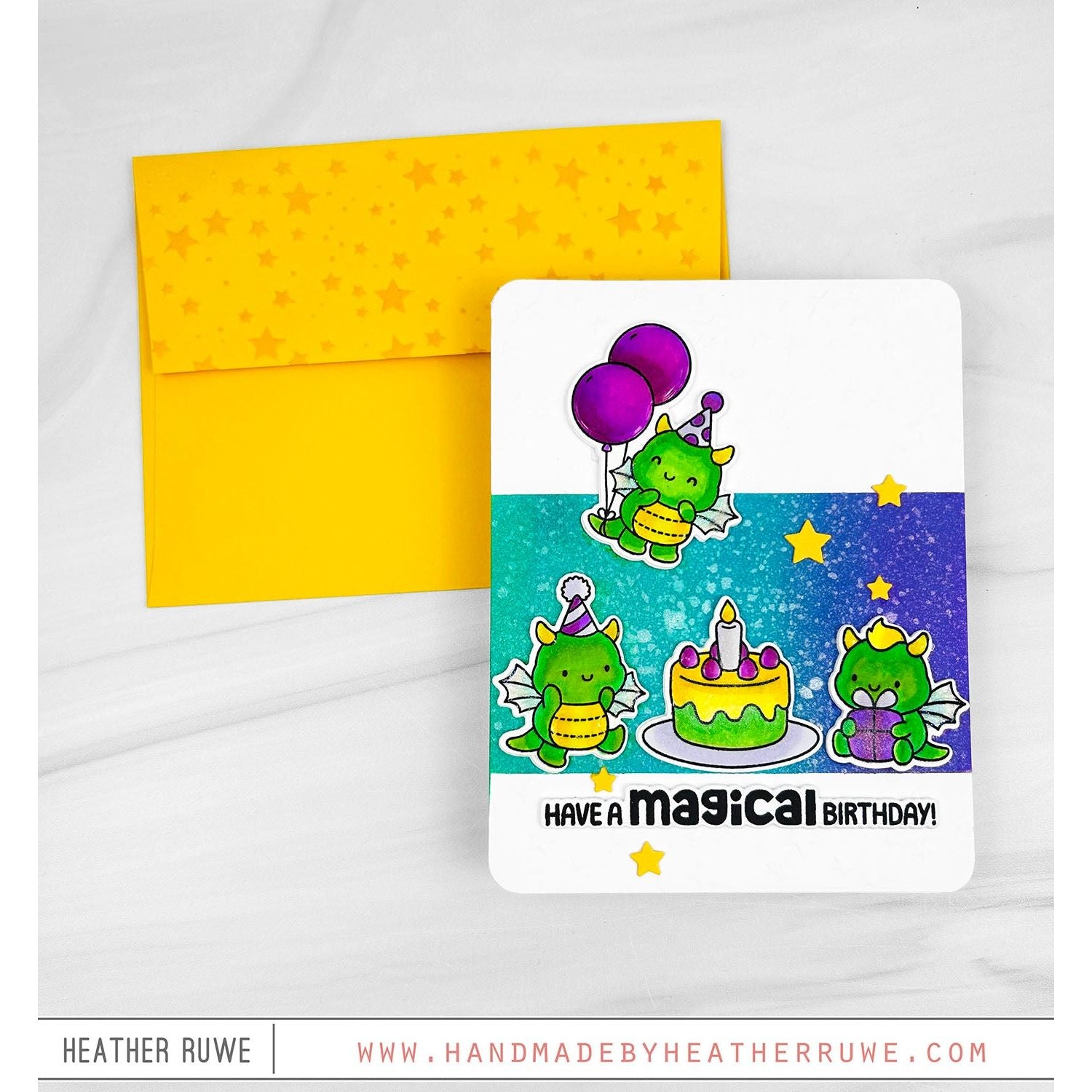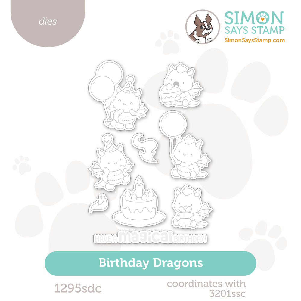The Simon Says Stamp Birthday Dragons coordinating dies are designed to precisely cut out all of the dragon illustrations and birthday-themed images from the Birthday Dragons stamp set, including the playful dragons holding balloons, gifts, and wearing party hats.
