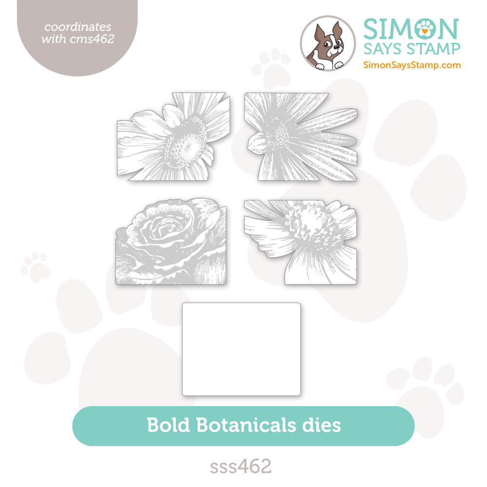 This set includes the dies to cut out 4 bold florals and 1 background rectangle. The background rectangle measures approximately 2.625 inches by 3.375 inches. Works beautifully with the Tim Holtz CMS462 Bold Botanicals stamp set.