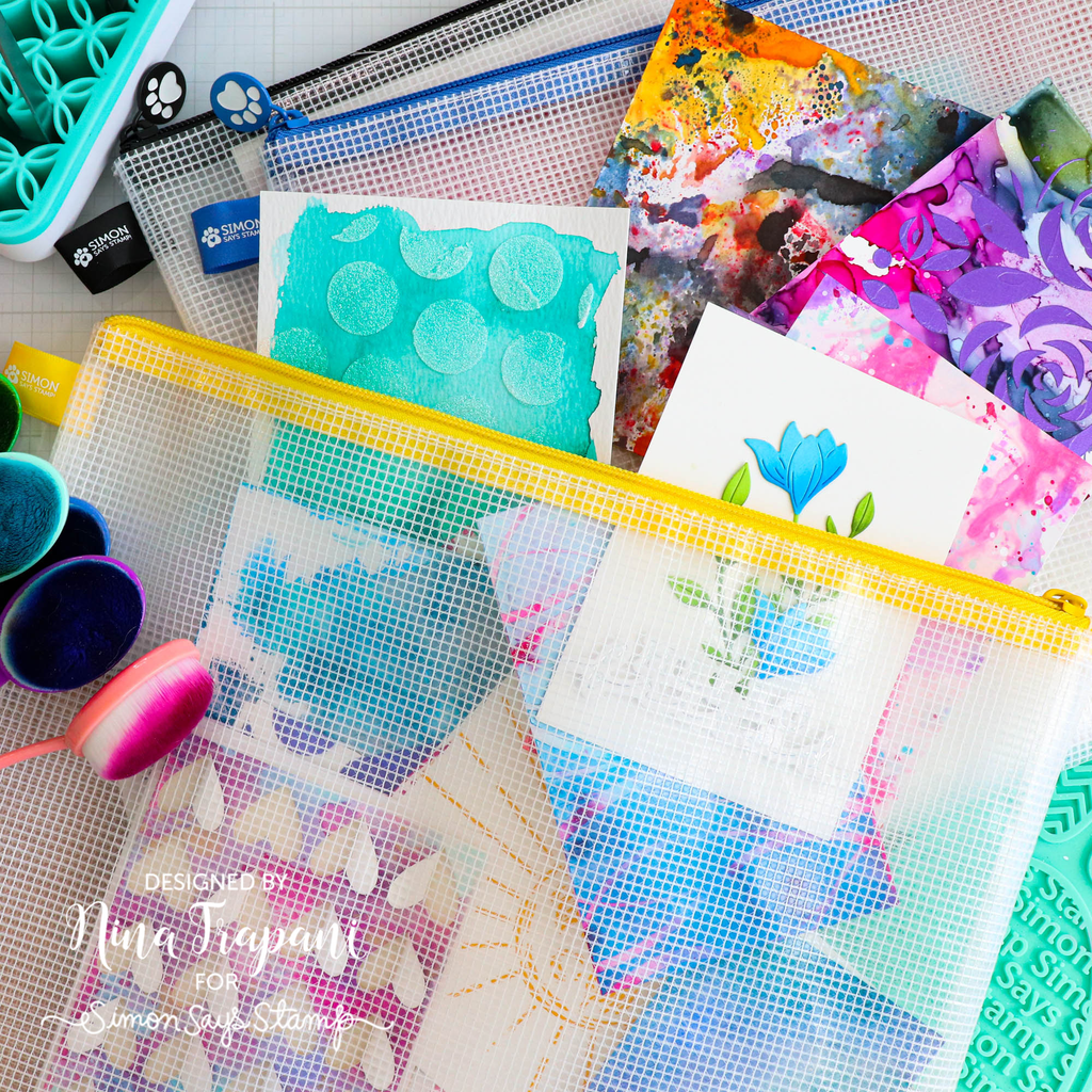Our Simon Says Stamp Mesh Bags are a pawsitively perfect storage solution for all your crafty supplies! The large 10 x 12.5 inch size allows for full-sized 8.5 x 11 inch paper sheets to fit inside. The flexible makeup of this bag also gives room for bulkier items such as jars or tools. The mesh material has a slick coating, which makes for easy clean-up if you put inky brushes into it. Not just for your craft room, our Mesh Bags are even great for traveling; place your favorite supplies inside and carry them with you for on-the-go crafty time! This is a pack of 3 bags.