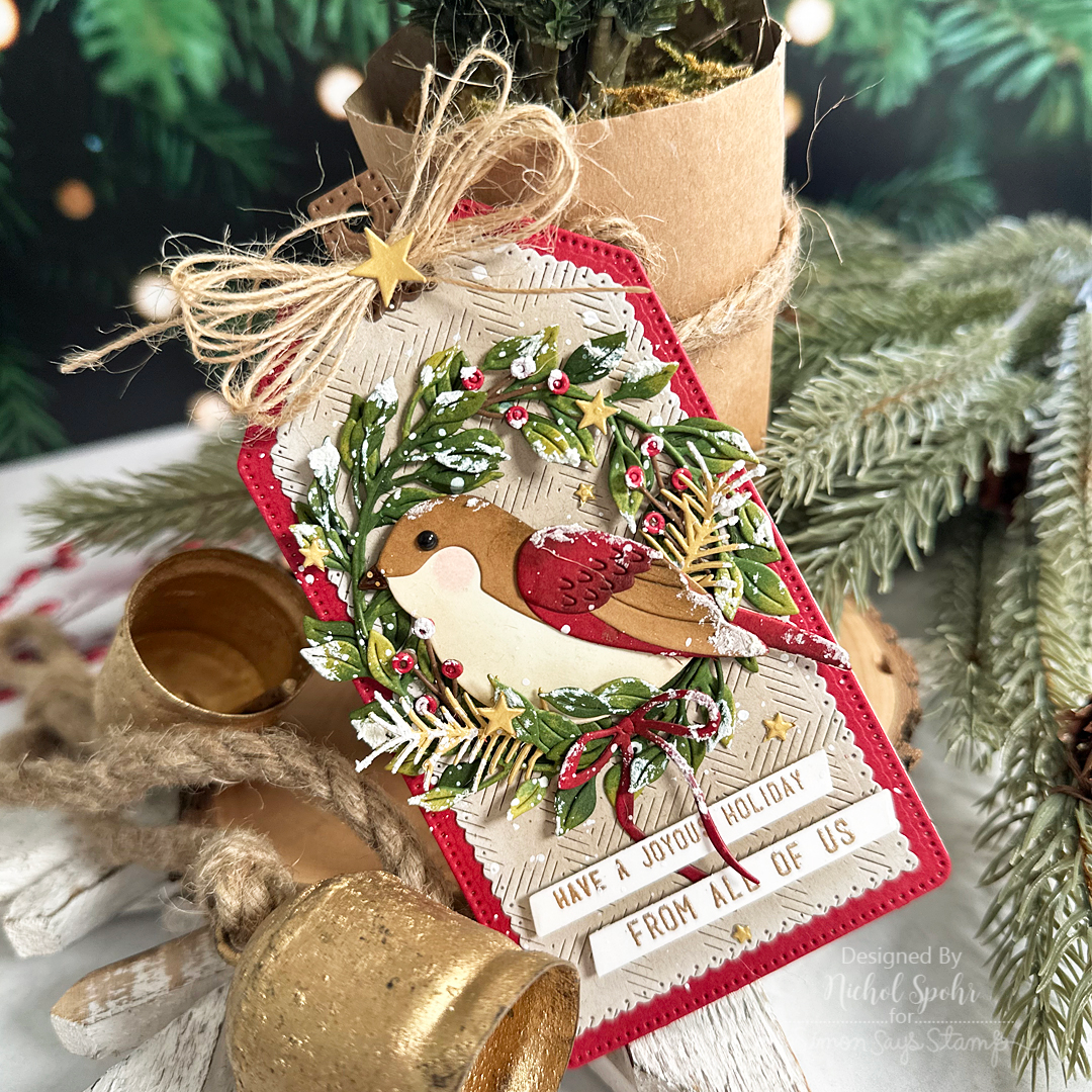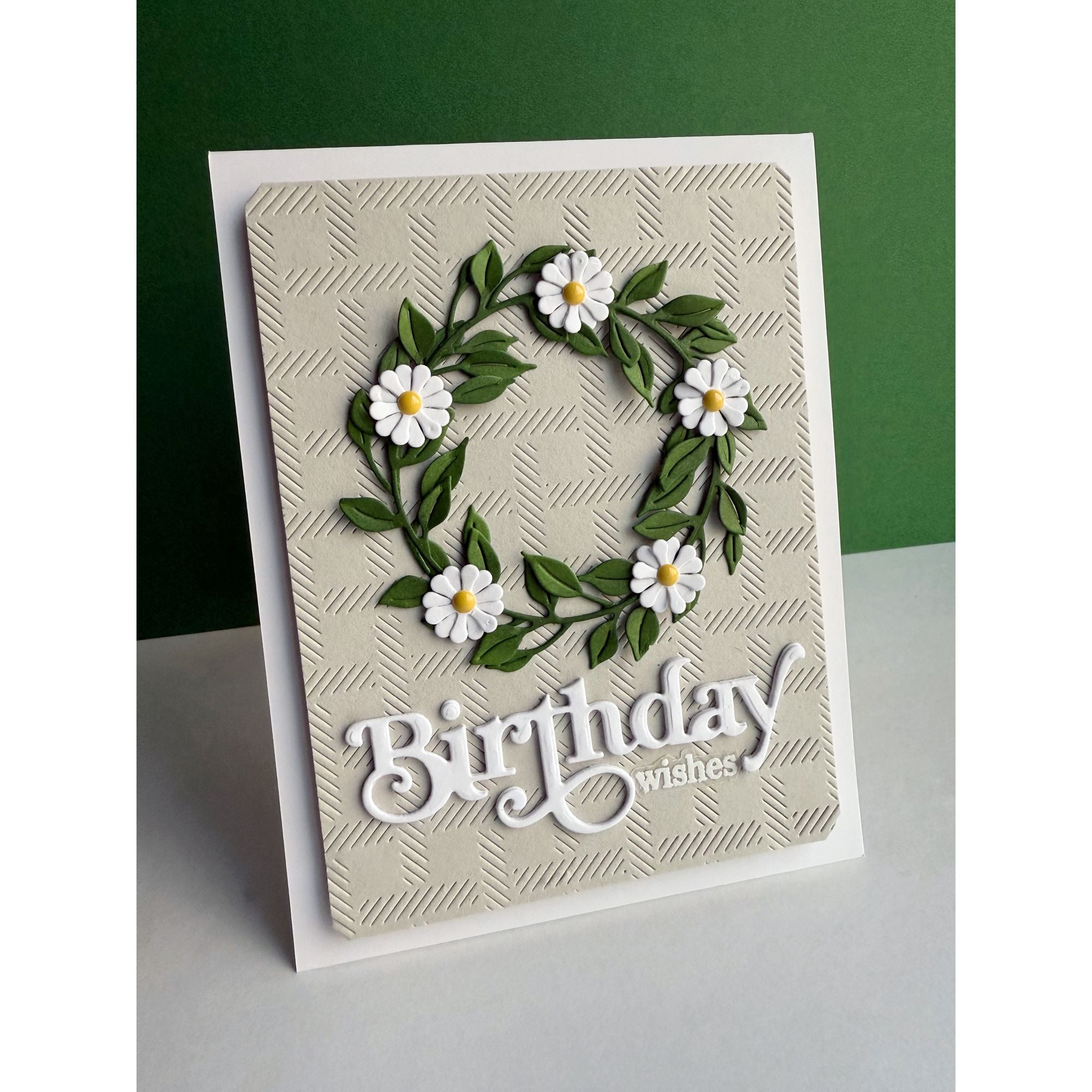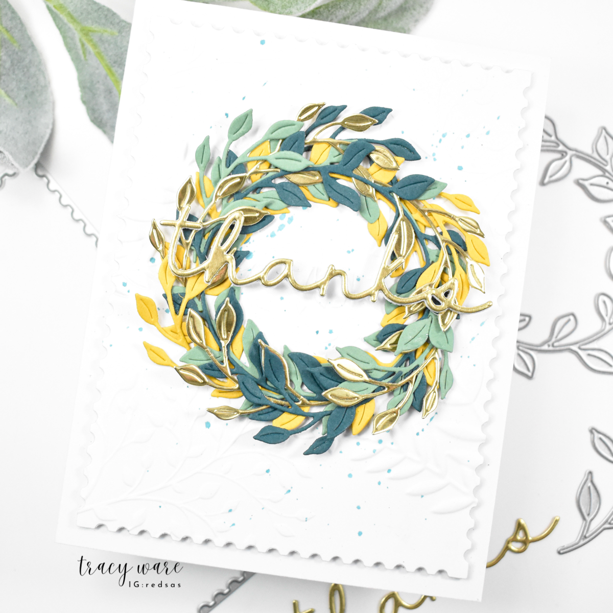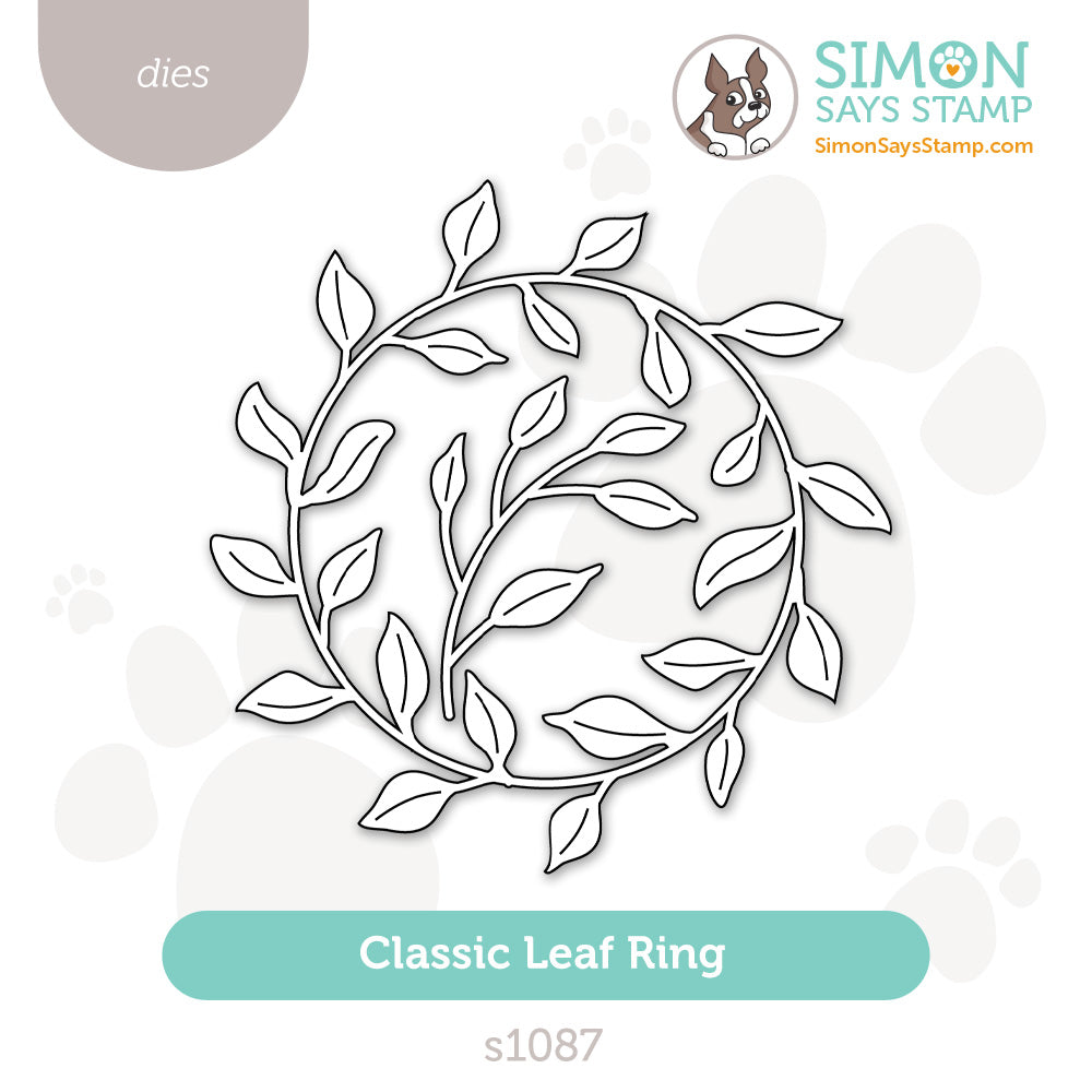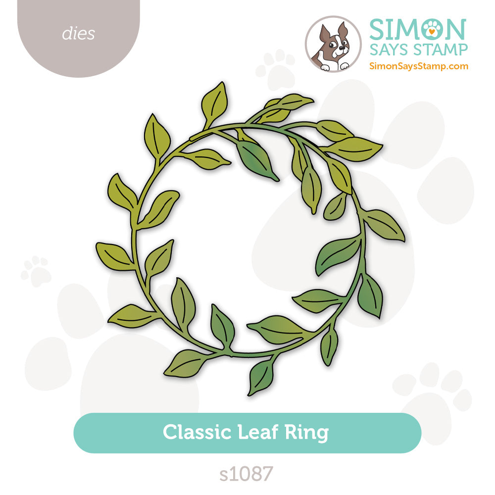 The Simon Says Stamp Classic Leaf Ring dies cut a graceful circular vine made of elliptical leaves that all tilt in the same direction, creating a smooth, continuous loop with no beginning or end. There is also an additional branch to allow you to add depth and girth to the leafy wreath.