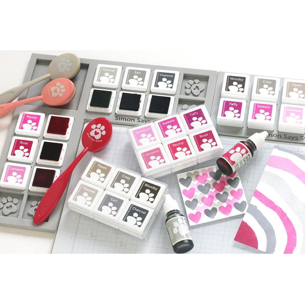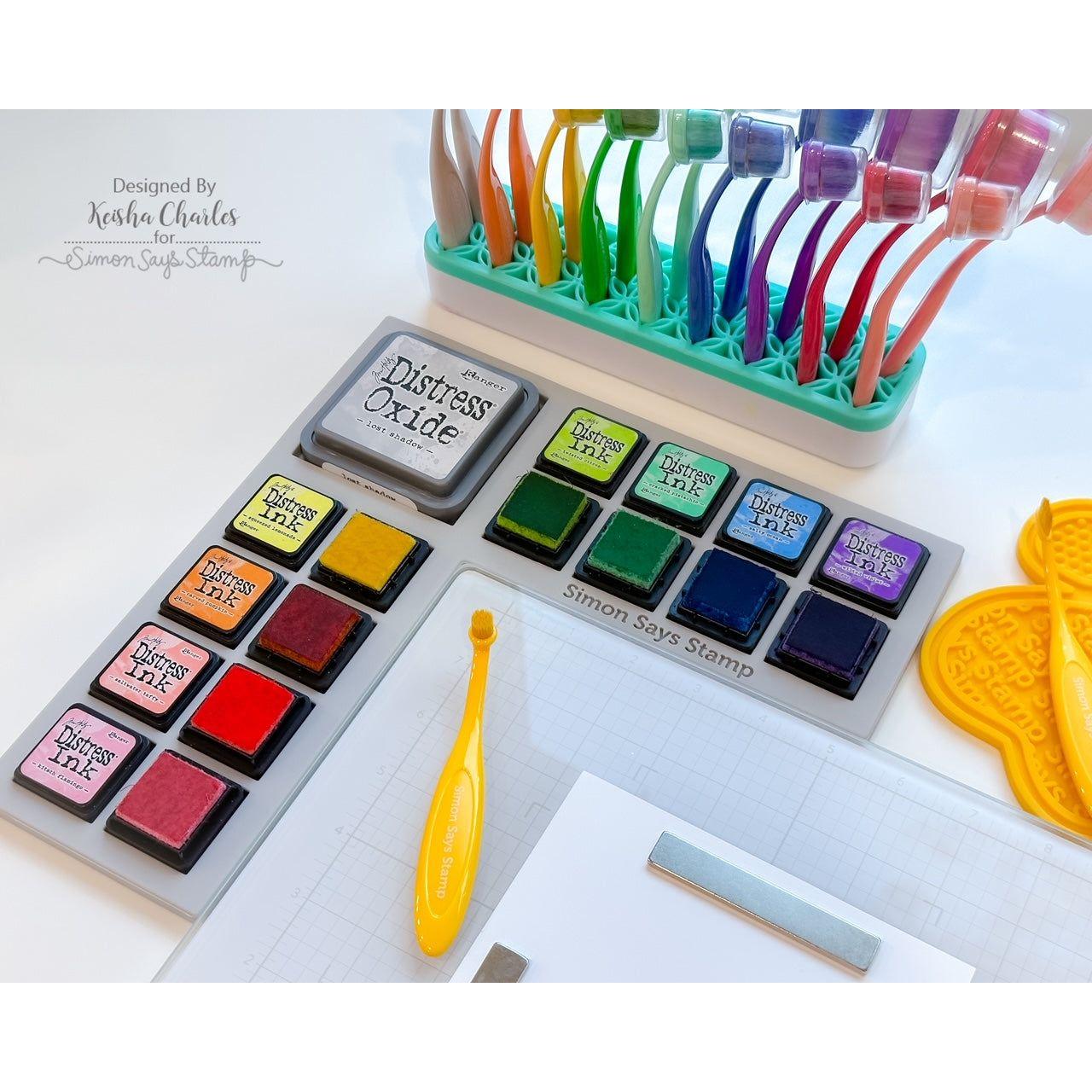 This product fits Simon exclusive ink cubes as well as other brands like Tim Holtz Distress cubes. The silicone material grips your pads (and even the lids) inside of each well, preventing them from sliding around on your work surface.