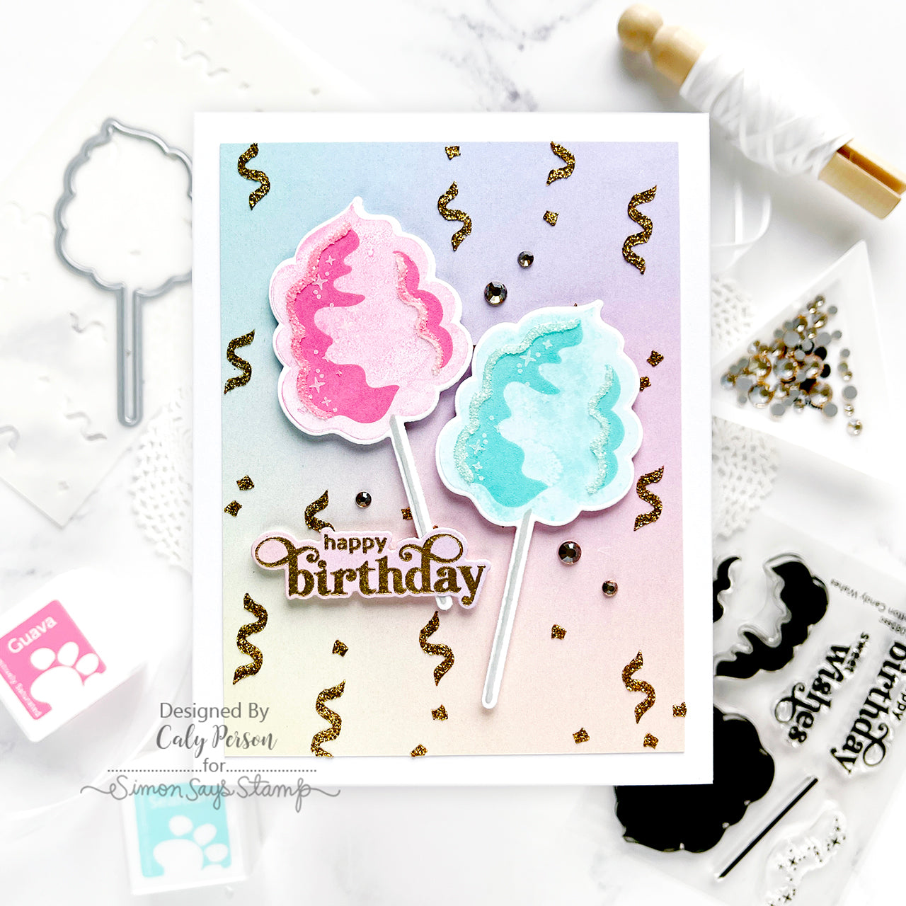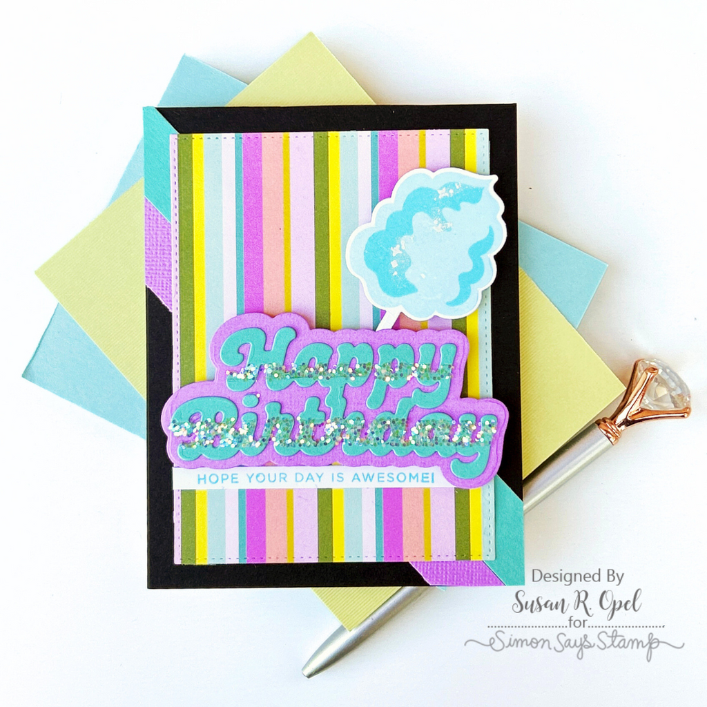 The Simon Says Stamp Cotton Candy Wishes dies perfectly cut out the finished cotton candy wand and the two celebratory sentiments from the coordinating stamp set.