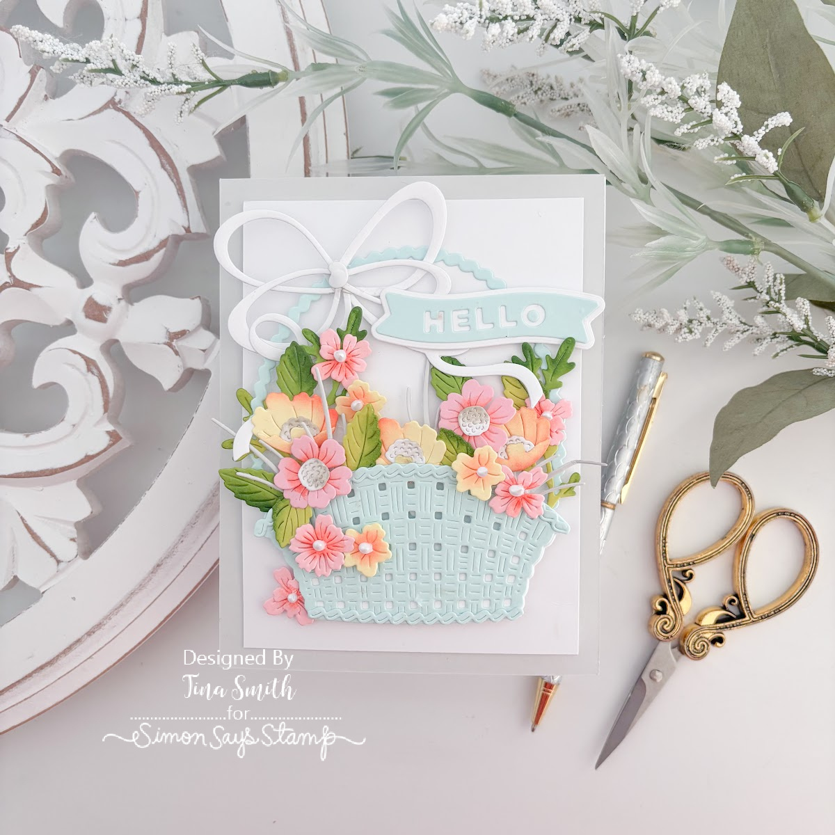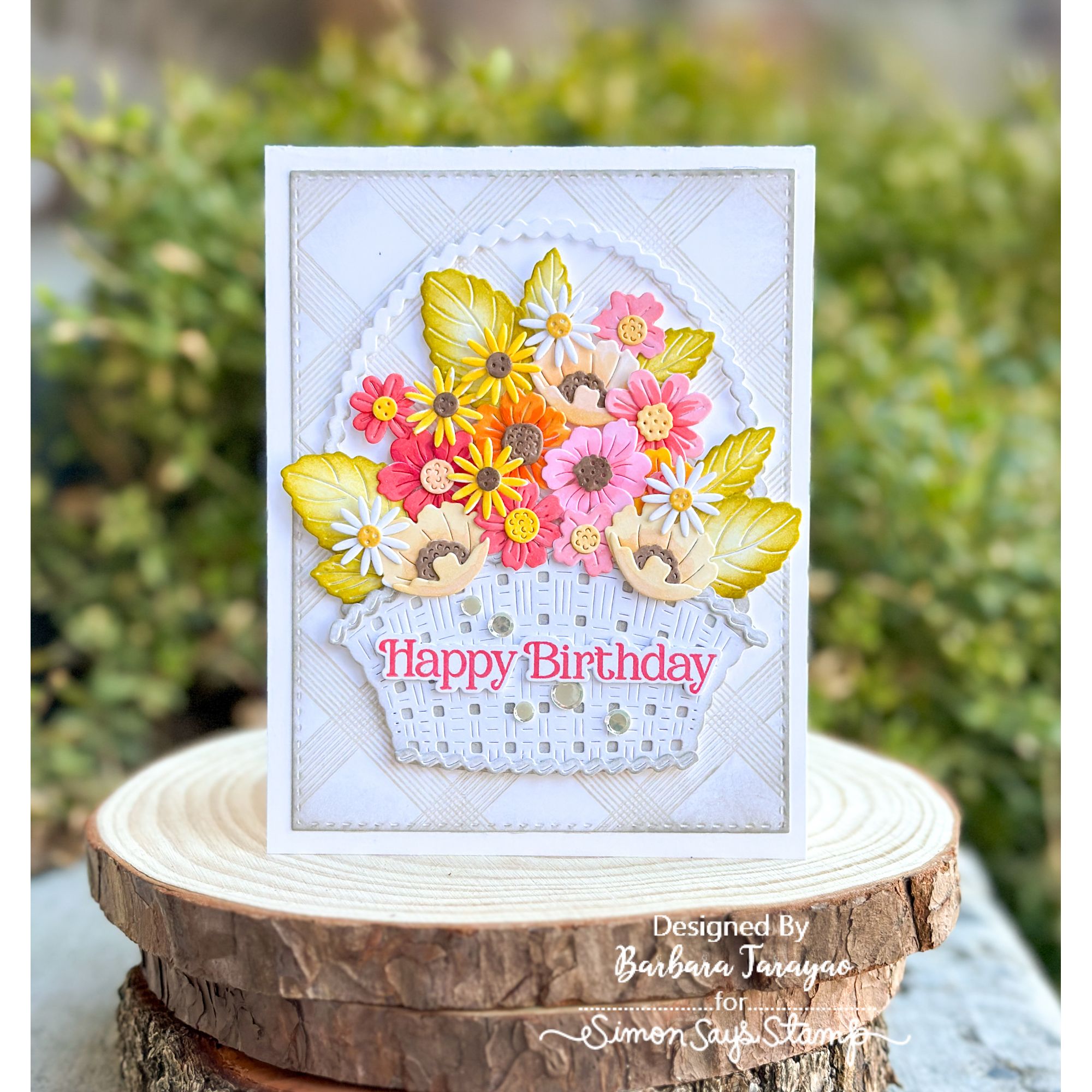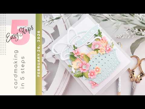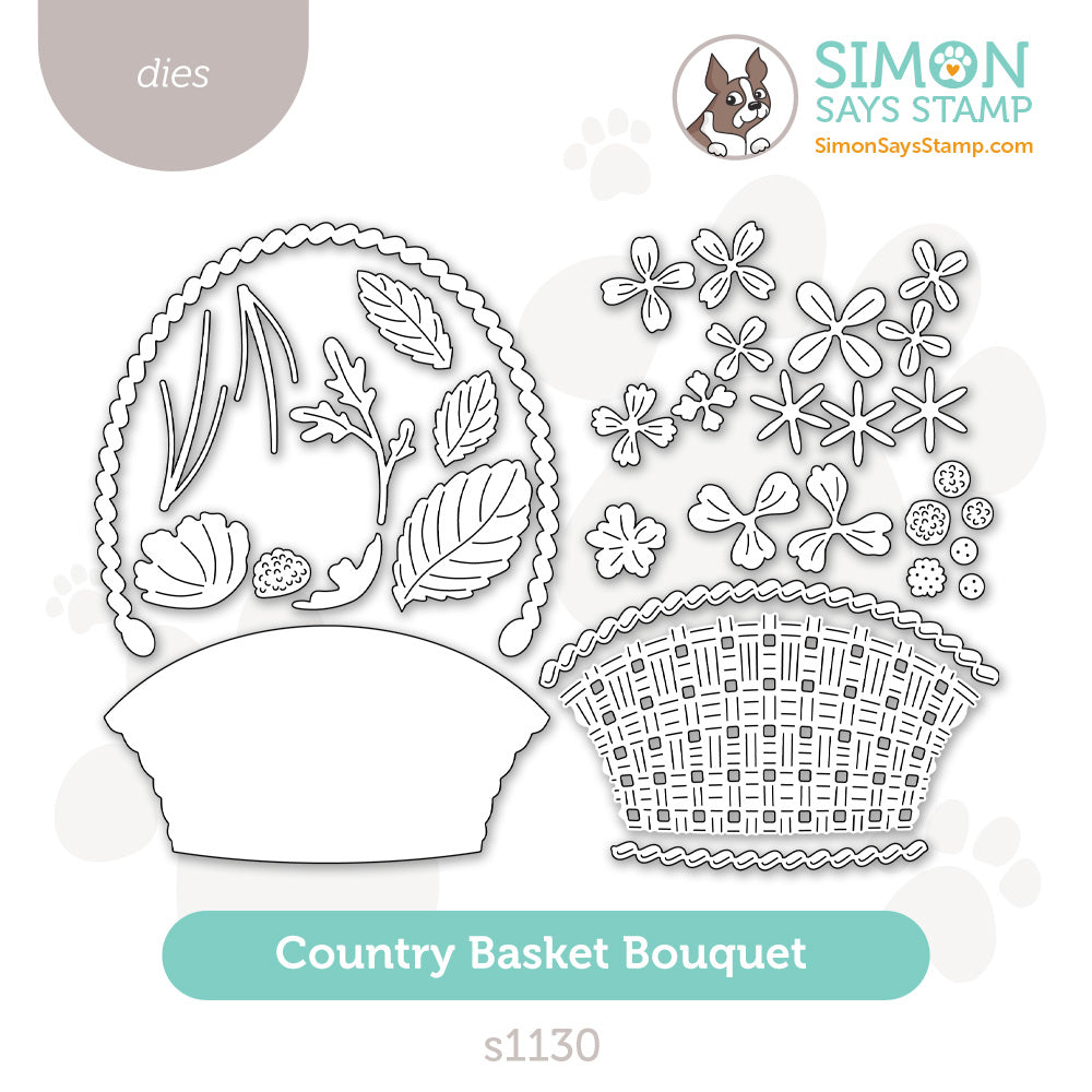 The Simon Says Stamp Country Basket Bouquet die set is a large, detailed collection designed to help you build a woven basket brimming with a variety of flowers. Layer the basket pieces to create texture and depth, then arrange the floral elements to form a full, abundant bouquet.