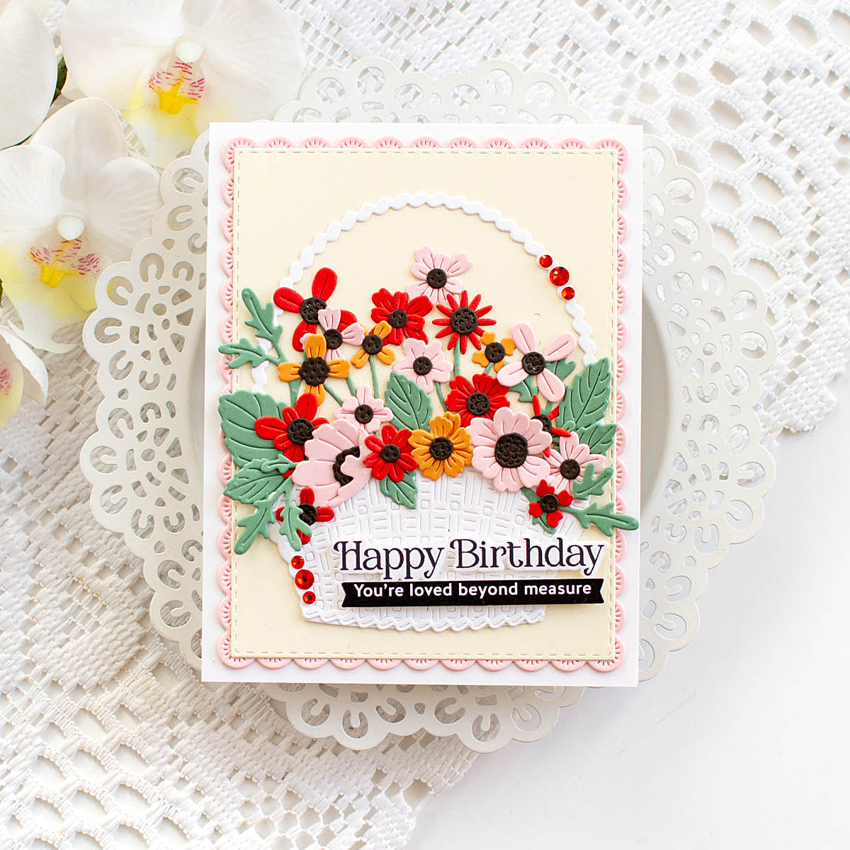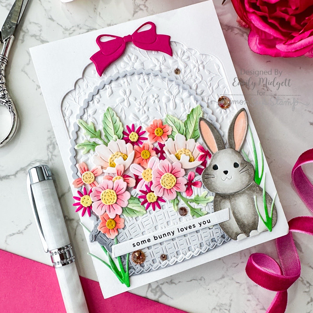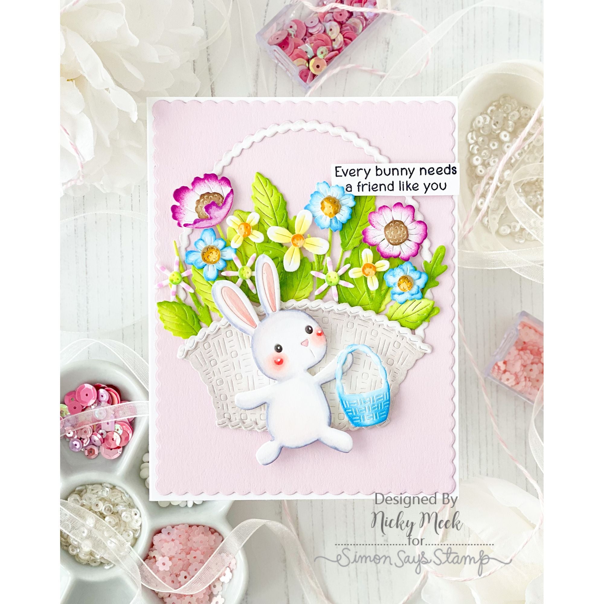 The Simon Says Stamp Country Basket Bouquet die set is a large, detailed collection designed to help you build a woven basket brimming with a variety of flowers. Layer the basket pieces to create texture and depth, then arrange the floral elements to form a full, abundant bouquet.