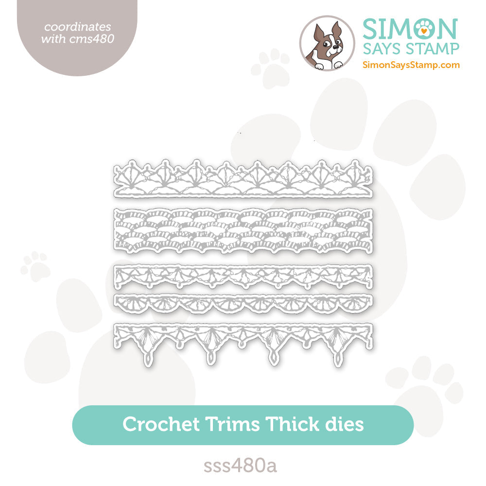 This die set includes the dies to cut out 5 of the Thick Crochet Trims. All of the trims measure approximately 6 inches long. The thickest trim measures approximately 1 inch wide. Works beautifully with the five thicker trims in the Tim Holtz CMS480 Crochet Trims stamp set.