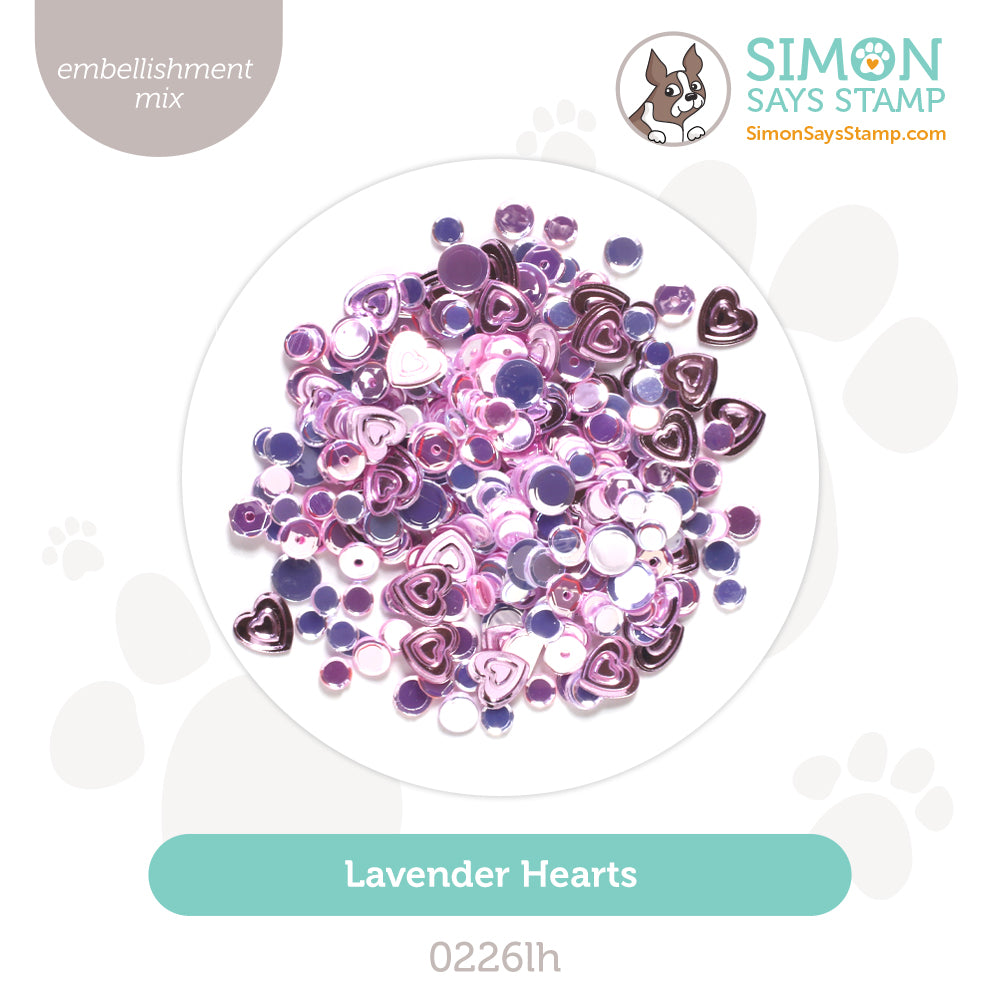 Bring a soft purply pink vibe to your crafts with the Simon Says Stamp Lavender Hearts Embellishment Mix.