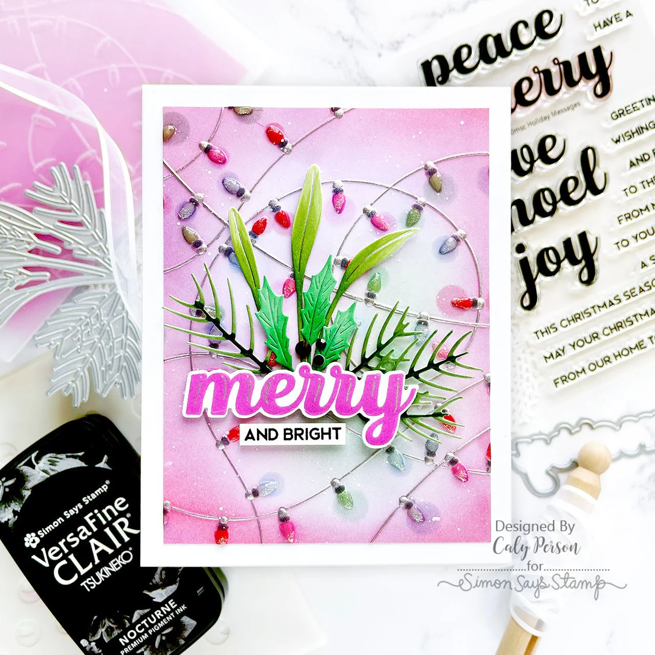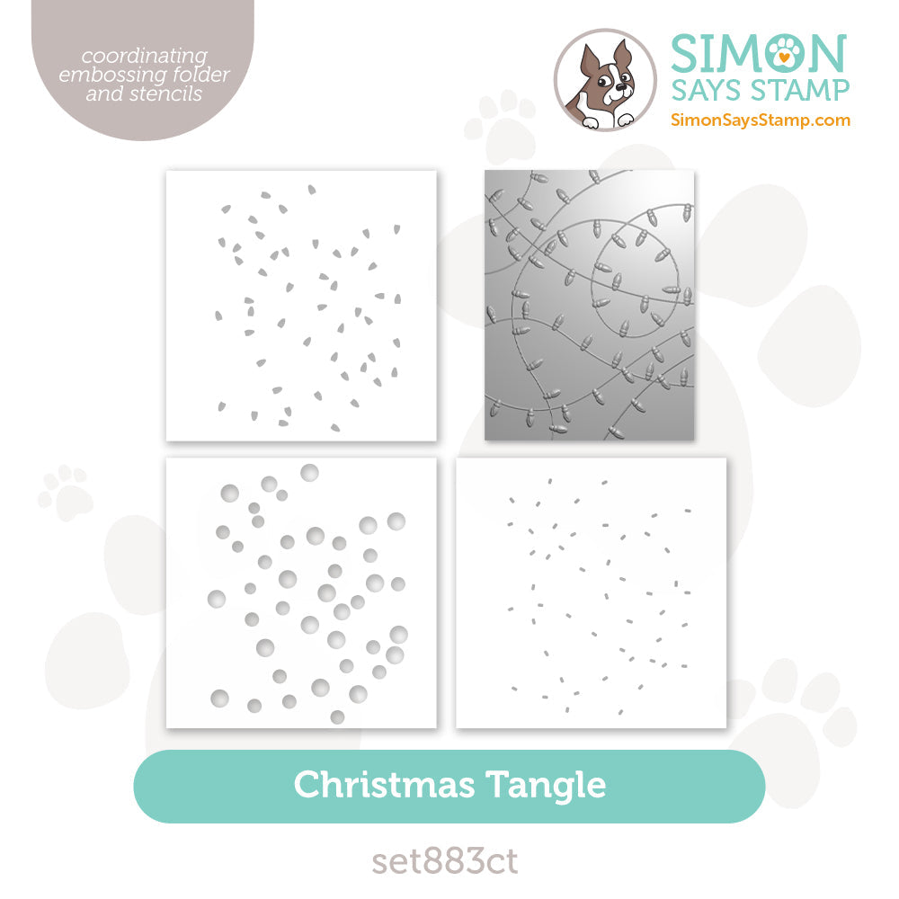 The Simon Says Stamp Christmas Tangle embossing folder and stencils set creates a fun, festive background of tangled Christmas lights. The looping design adds a whimsical touch to holiday cards and projects.