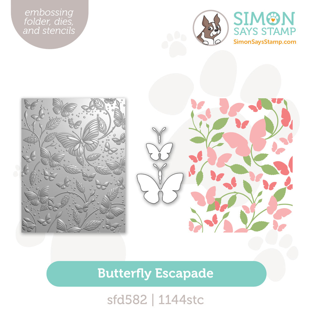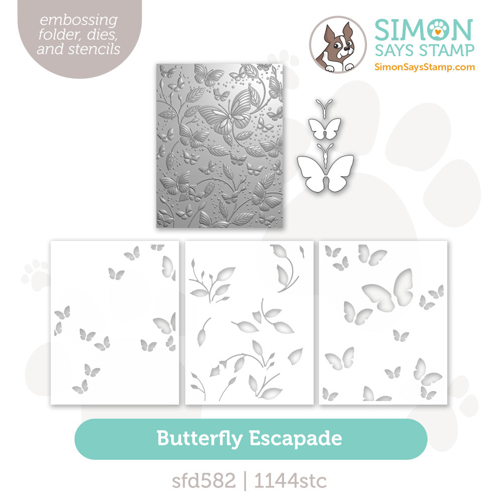 The Simon Says Stamp Butterfly Escapade embossing folder, dies, and stencil bundle creates a beautifully detailed panel filled with fanciful butterflies and swirling vines. The embossed design adds graceful movement and texture, making it a stunning background for cards and layered projects. Add color to the embossed butterflies with the stencils. The coordinating dies are included to cut out butterfly wings and bodies in two sizes, allowing you to lift them from the background and add dimensional accents. (We recommend die cutting first to avoid flattening the embossing.)