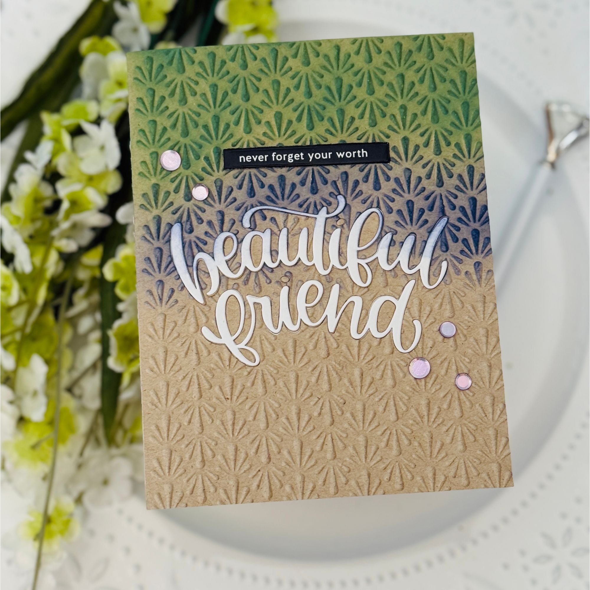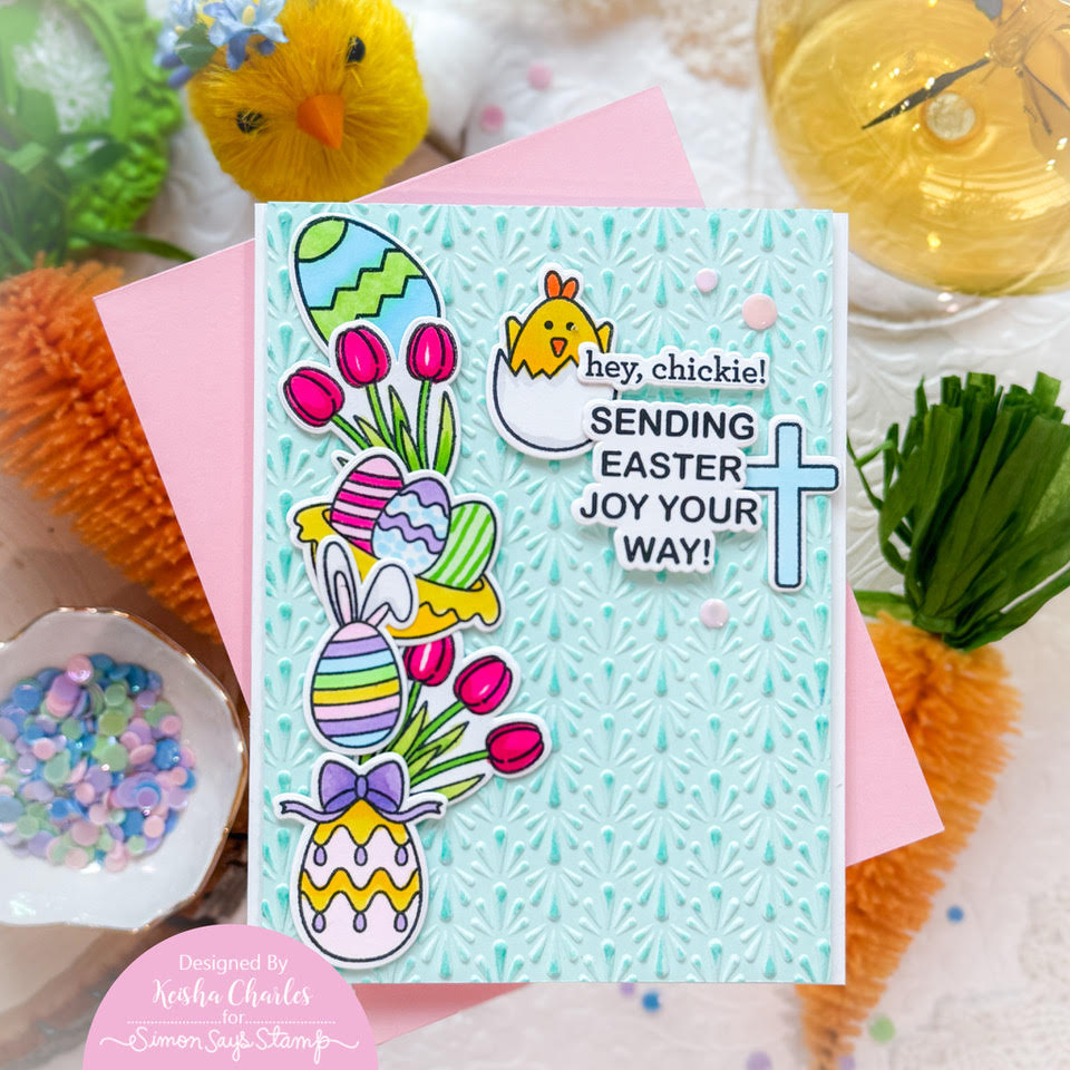 The Simon Says Stamp Fanfare embossing folder creates a full A2 background of vertical rows of repeating fan shapes. Each row alternates direction, adding movement, texture, and visual interest to your projects.